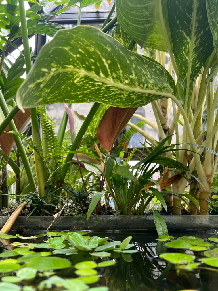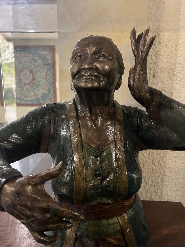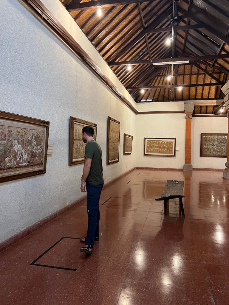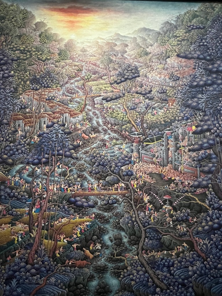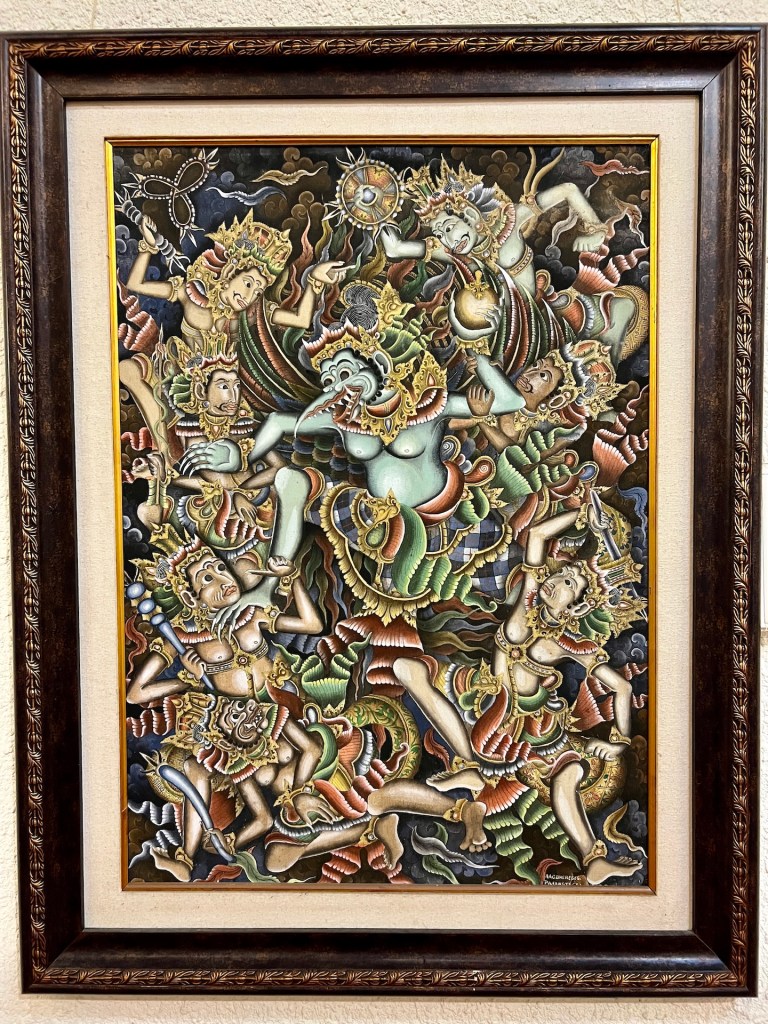 Schon die erste Installation gefällt uns. Ein japanischer Wassergarten in einem hochgestellten Glashaus. Mit Fischen, Seerosen und Pflanzen aller Art. Danach folgen Kunstwerke und Schnitzereien aus verschiedenen Jahrhunderten indonesischer Geschichte. Der Stil ist sehr Typisch für Ubud. Die meisten erzählen die Geschichte der Götter und Dämonen. Jana betrachtet ein im Bali-Stil gemaltes Kunstwerk, als hinter ihr ein lautes „Aahh!“, erklingt. Christian hält seinen Nacken fest und blickt auf einen daumengroßen schwarzen Punkt auf dem Boden, der gerade wegkrabbeln will. Der Nacken von Christian ist zwar rot, aber kein Stich zu erkennen. Das Tier wird erstmal unter die Lupe genommen. Google Lens verrät uns, dass es sich hier um eine ungefährliche Schlammwespe handelt. Puh. Glück gehabt. Wie aufregend doch Kunst sein kann. 🤣