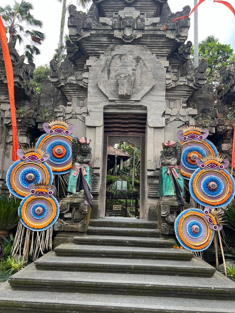 Wir ziehen um. Diese Unterkunft in Ubud, das Utu Homestay gefällt uns wirklich sehr gut. Leider konnten wir den Aufenthalt hier nicht verlängern. Zum Glück gibt es in der gleichen Straße mehrere Homestays. Ein letztes großartiges Frühstück, Sachen packen und einmal über die Straße laufen. Wir werden herzlich verabschiedet und auch wieder herzlich empfangen. Wie immer in Indonesien. Mit der Dame laufen wir die ganze Straße wieder zurück, durch eine schmale Gasse bis zum versteckten Juwel. Das Praety Homestay hat einen schönen Garten mit Tempeln und Steinfiguren. Die Türen sind prunkvoll verziert und das Zimmer ist angenehm groß. Das war der schnellste Umzug, seit wir losgezogen sind. 😉