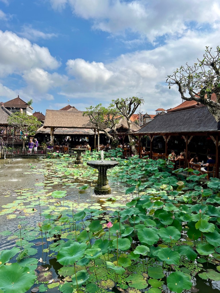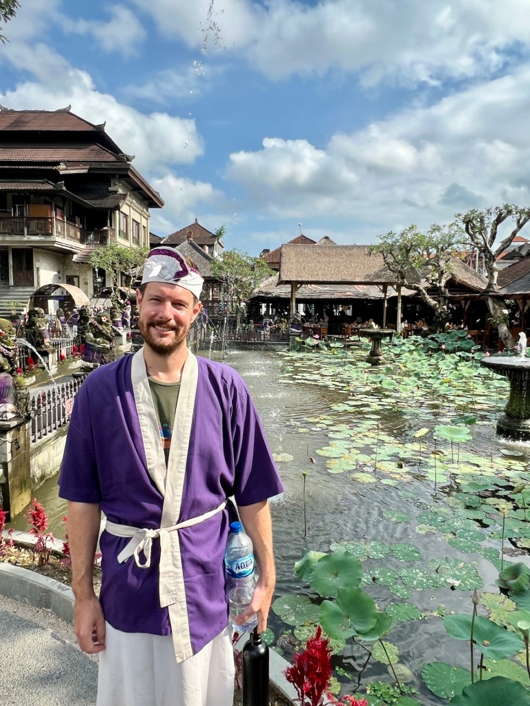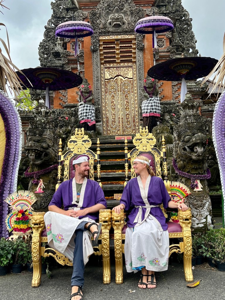 Das Museum war ein schöner Ausflug in die Kunstwelt Balis. Weiter geht es zum Wassertempel. Eigentlich zahlt man für die Besichtigung eines Tempels nichts. Es sei denn, es gibt Touristen an den Orten, denn die zahlen auch für Gebetshäuser 😏 Also zahlen wir 50K (2,88 EUR) Eintritt und bekommen dafür eine „fast“ traditionelle Kleidung. Der Kopfschmuck passt, für Cristian auch der Sarong und das Oberteil. Doch die Frauen Balis tragen in der Regel obenrum eine Art enge Netzbluse und keinen Sack. 🤣 Jana hat keine Wahl und so laufen wir beide mit all den anderen lila Minions durch den Tempel. Wir setzen uns auch auf die vergoldeten Stühle und machen ein typisches Ubud-Wassertempel-Foto. Für alle da draußen: KEIN HOCHZEITSFOTO 🤣
