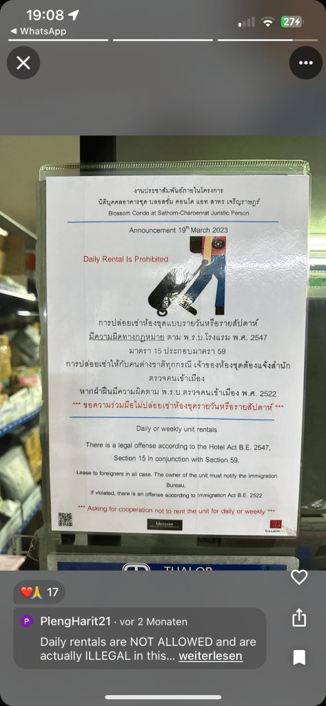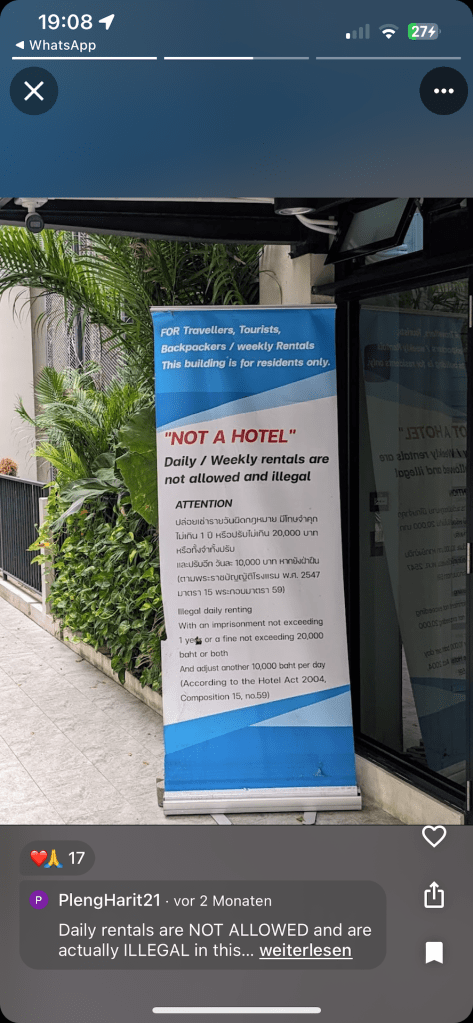 Wir recherchieren und finden bei der Unterkunft in Bangkok mehrere Informationen, dass Touristen dort nicht erwünscht sind. Nicht nur das. In Bangkok ist ein Vermieten der eigenen Wohnung unter einem Monat sogar unter Strafe verboten. Weder der Vermieter, noch AirBnB hat darauf hingewiesen. Wie auch? Der Vermieter will Geld verdienen und AirBnB stützt sich auf seine AGB und überträgt die Verantwortung an den Vermieter. Wir schreiben den Vermieter an und er versichert uns, dass wir keine Probleme bekommen werden, nur die Wahrheit sollen wir nicht sagen. WIR? Wir beiden sind nicht gerade fürs Lügen bekannt. Vor allem wollen wir nicht lügen! Das fühlt sich falsch an. Auf den Fotos im Internet sehen wir große Plakate verteilt auf dem gesamten Grundstück der Unterkunft: „Touristen nicht Willkommen!“ „Strafe.“ Nein! Das ist nichts für uns.