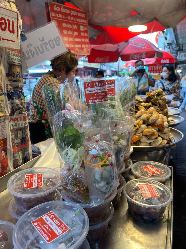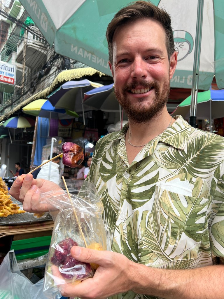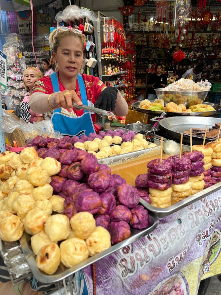 Im Homestay gibt es kein Frühstück, da jedes Zimmer auch eine Küche hat. Macht aber nichts. Bei unserem letzten Aufenthalt in Thailand haben wir uns in einen Joghurt verliebt. 🤣 Den haben wir fast jeden Tag gegessen. Im 7Eleven haben wir uns mit dem Nata de Coco Joghurt und Müsli eingedeckt. Danach schlendern wir durch Chinatown und lassen uns durch das Gewusel der Straßen und Einkaufsgassen tragen. Wir snacken leckere Frühlingsrollen an einem winzigen Stand und am nächsten süße Kartoffelbällchen. Und überall riecht es nach Durian und leckerem Essen. Hach, schön wieder hier zu sein.