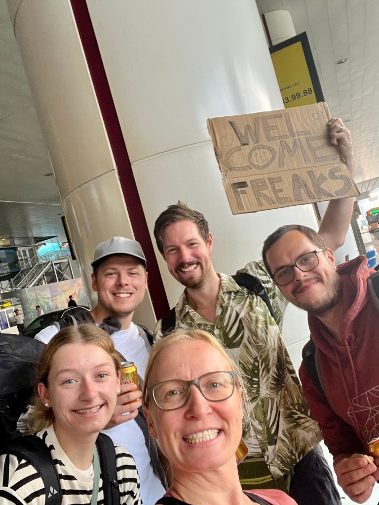 Wir sind kaum eingeschlafen, da stehen wir auch schon wieder auf 🫣 Völlig verschlafen packen wir uns das Willkommen-Schild, das Begrüßungsbier und bestellen ein Taxi zum Flughafen. Unser Timing ist super. Wir erreichen um kurz vor sechs das Ankunftsterminal. Etwa zur gleichen Zeit landet das Flugzug mit unserem Besuch. Wir sind zwar müde, aber freuen uns jetzt mal so richtig auf das Wiedersehen. Kurze Zeit später können wir erst Emma und dann auch die anderen beiden durch die Glastüren der Empfangshalle sehen. Freudig winken wir. Jetzt trennt uns nur noch die Gepäckausgabe. Tja. Und auf das Gepäck warten wir eine geschlagene Stunde. Dann endlich drücken wir uns zur Begrüßung. Ein gutes Gefühl. Auf dem Weg zur Unterkunft prasseln die Eindrücke auf unsere Neuankömmlinge ein. Besonders der Straßenverkehr lässt sie schmunzeln. Schön, das noch einmal mitzufühlen 🙃 Wir besprechen außerdem die Strategie, auch im Flugzeug wurde nicht viel geschlafen, dazu die Zeitverschiebung. Wir sind uns einig, die einzig richtige Lösung lautet; durchziehen. Also erfrischen sich alle erst mal in der Unterkunft bevor wir die Stadt unsicher machen.