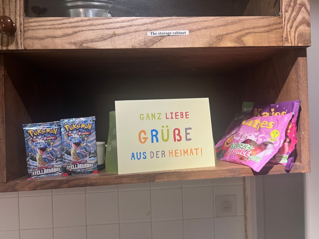 Zu unserer Überraschung gibt es Mitbringsel aus der Heimat. Die Kollegen aus der Firma haben eine Grußkarte mitgegeben auf dem alle unterschrieben haben, da Christian anscheinend immer das selbe Hemd trägt hat ein aufmerksamer Follower ein neues Hemd mitgegeben, welches erstaunlich gut sitzt und unser lieber Erik hat uns unsere Lieblingssüßigkeiten und Sammelkarten zukommen lassen. Wir sind gerührt und freuen uns mächtig, Danke. 🥰