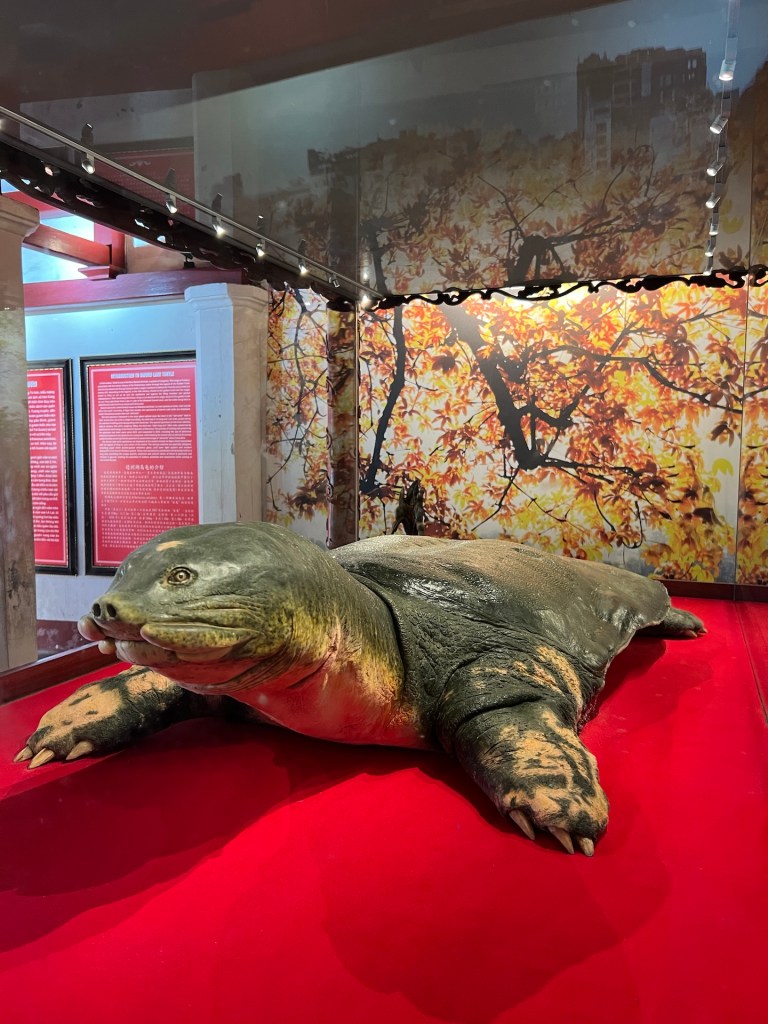 Auf dem Weg zu unserem ersten Tagesziel halten wir nach einem geeigneten Frühstück Ausschau und das ist gar nicht so einfach ist. Es gibt zwar unzählige Cafés, die haben aber selten Essen. Die kleinen Stände am Straßenrand tun sich schwer damit vegetarisches Essen anzubieten und so landen wir nach den ersten Kilometern in einem Laden der Banh Mi verkauft. Die kleinen, gefüllten Baguettes gibt es hier an jeder Ecke. Nach der Stärkung geht es in den Ngoc Son Temple. Die konfuzianische Tempelanlage befindet sich auf einer kleinen Insel und ist vom Hoan Kiem See umgeben. Es wird unter anderem die Geschichte über die Schwertschildkröten erzählt die einem König zum Sieg über seine Feinde geholfen haben sollen. Zwei Exemplare dieser mächtigen Geschöpfe sind hier, präpariert, ausgestellt.