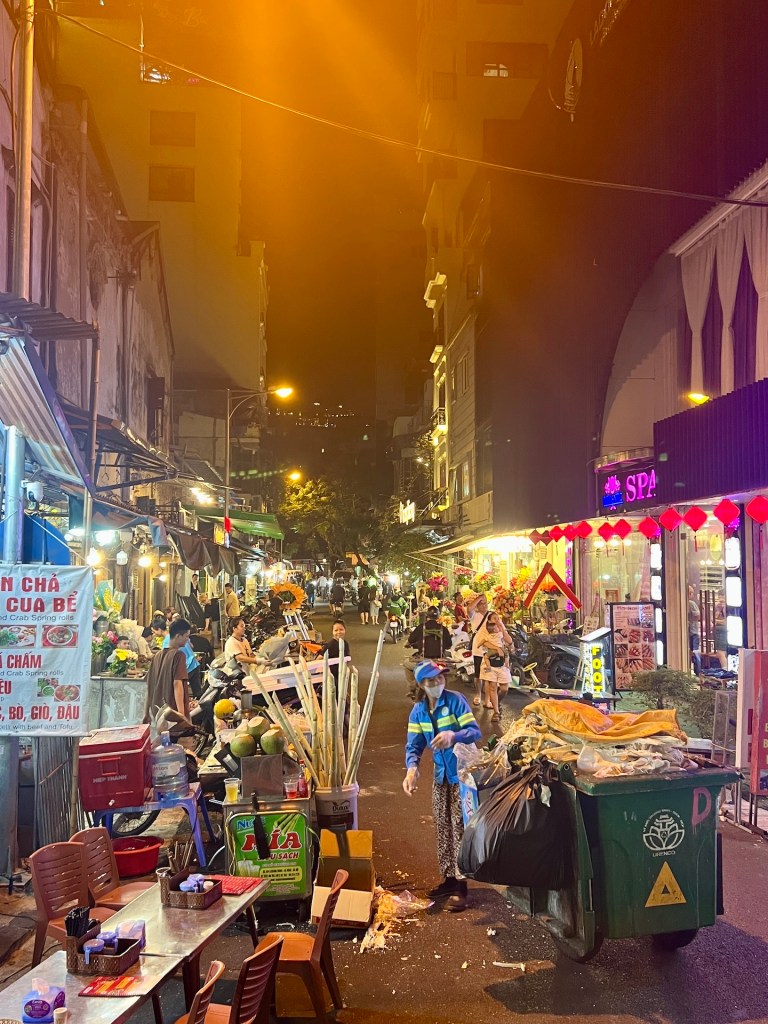 Ja, eben erst gelandet aber es gibt die ein oder anderen Souvenirs die nicht bis zur Abreise warten können, weil praktisch. Daniel organisiert sich ein paar Birkenstocks und es gibt für jeden eine Bauchtasche. Nach so viel Action ist es „endlich“ Zeit fürs Abendessen. Jana und Christian empfehlen die vegetarischen Ramen von Vegi-Ro. So sei es. Der Laden befindet sich in direkter Nachbarschaft zu unserer Unterkunft. Wir speisen und trinken vorzüglich. Zeit für die Abendplanung. Es soll auf die Beerstreet gehen, eine Party-Meile in der Altstadt von Hanoi. Jana muss sich bedauerlicher Weise ausklinken. Den Tag über hatte sie schon mit Kopfschmerzen zu kämpfen und die sind bis jetzt nicht besser geworden. Gesundheit geht vor. So ziehen die übrigen vier erst über den Nachtmarkt und dann in die Beerstreet.