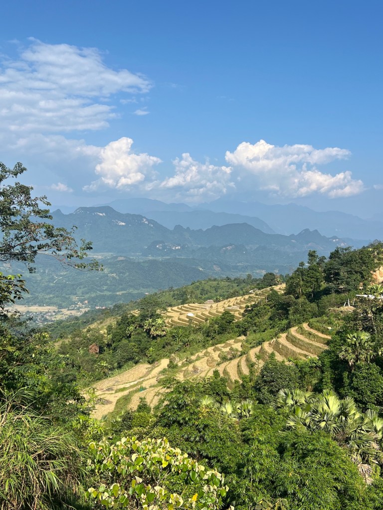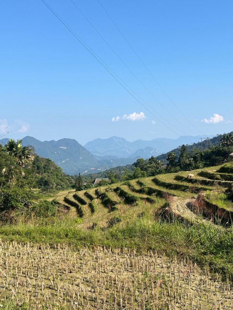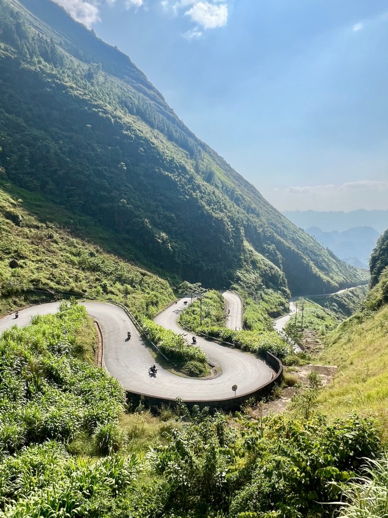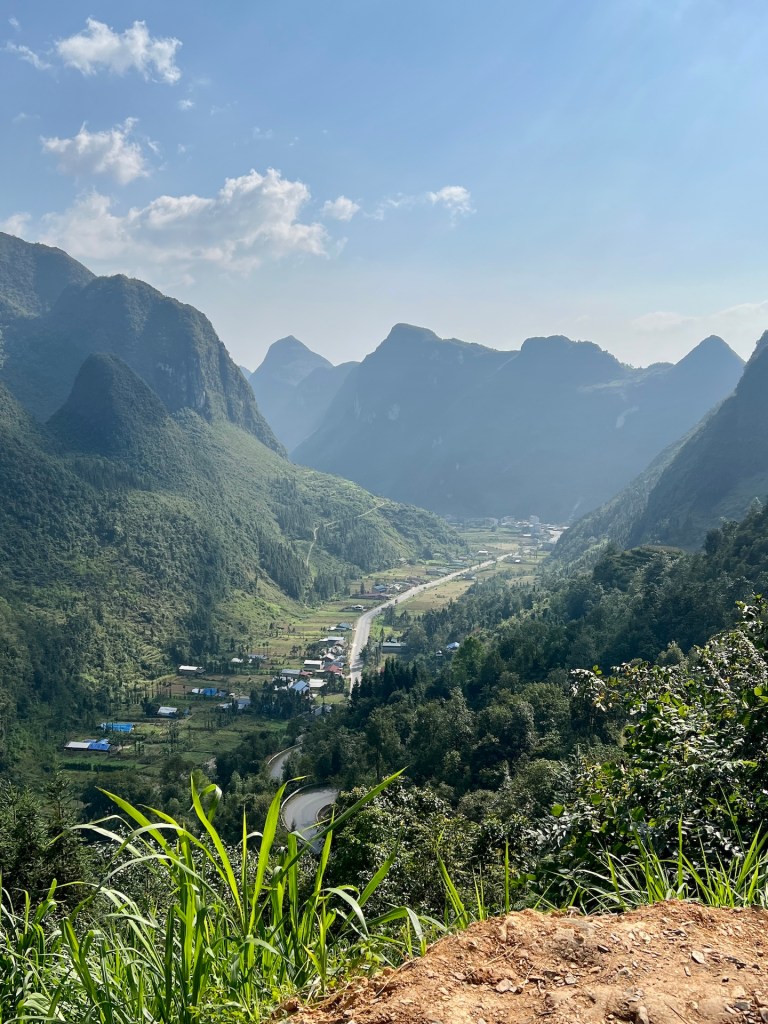Schon der erste Pass beeindruckt mit seinen entspannten Kurven und Serpentinen zwischen Reisfeldern und bewachsenen Karststeinfelsen. Christian hat sich mit der Halbautomatik mittlerweile angefreundet und nimmt jede Kurve souverän. Beide kommen wir nicht aus dem Staunen raus. Jede Kurve bietet ein neuen unbezahlbaren Anblick. Nach dem Pass geraten wir direkt in eine Polizeikontrolle. Wir freuen uns wie Kinder, als wir die Papiere vorzeigen dürfen, da wir die richtigen dabei haben. 👮♂️ Der Polizist freut sich mindestens genauso. Wir müssen nichts bezahlen und können ohne Strafe weiterziehen. Die Straße ist zum großen Teil sehr gut asphaltiert, nur ab und an kommen kleine Felsabgänge oder staubige Baustellen. Wir überholen die ein oder andere Easyrider-Tour oder fahren sogar ein bisschen mit ihnen. Das macht Spaß und die Zeit vergeht im Scooterflow. Wir nehmen den ein oder anderen Viewpoint oder Blumenwiese mit, genießen Tofu in Tomatensoßen vor einer Kulisse aus Feldern und Bergen und kurz vor unserem Ziel Dong Van gleiten wir über die schönsten Serpentinen der ersten Etappe.