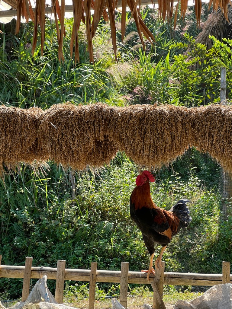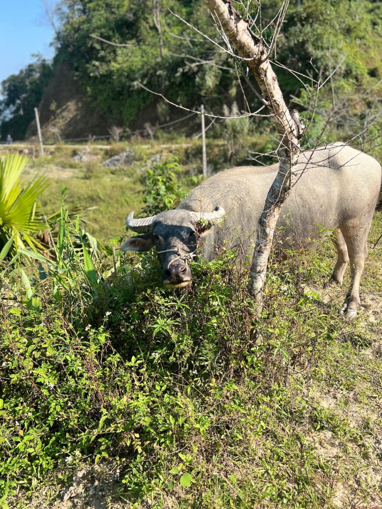 Unser erstes Ziel ist ein kleines ethnisches Dorf zehn Kilometer entfernt. Wir fahren durch Reisterrassen und an Holzhütten vorbei, die wir bisher nur aus dem Museum kennen. Eine beeindruckende Landschaft. Das macht Lust auf mehr und endlich fühlen wir, wie wir so langsam wieder aus unserem Loch herauskriechen. An der schmalen Bergstraße stehen immer wieder Wasserbüffel. Als Jana einen aus der Nähe fotografiert, bewegt er sich ruckartig auf sie zu. So schnell saß sie noch nie auf dem Roller. Uns wurde bereits vorher gesagt, dass der Norden nicht mehr so schön ist, weil die Reisfelder alle abgeerntet sind. Wir finden, dass es immer noch atemberaubend aussieht. Seht selbst.