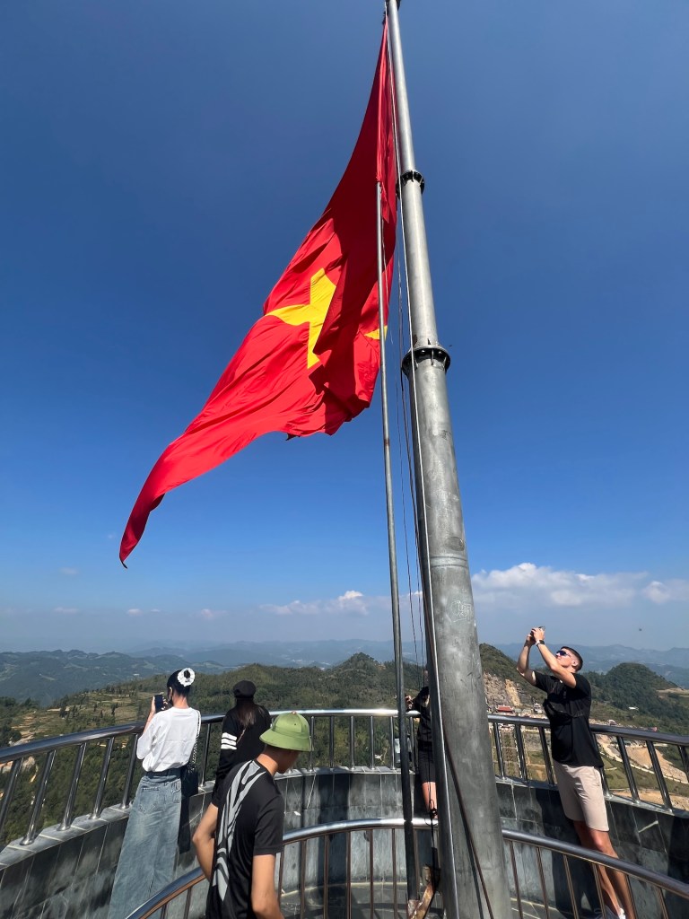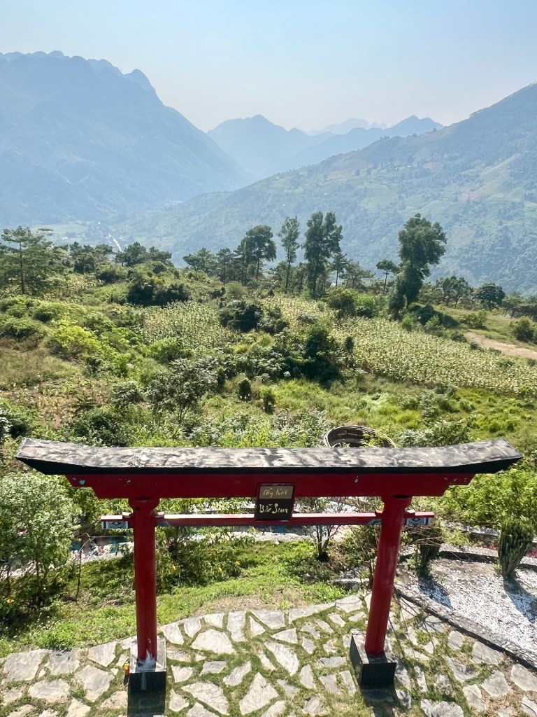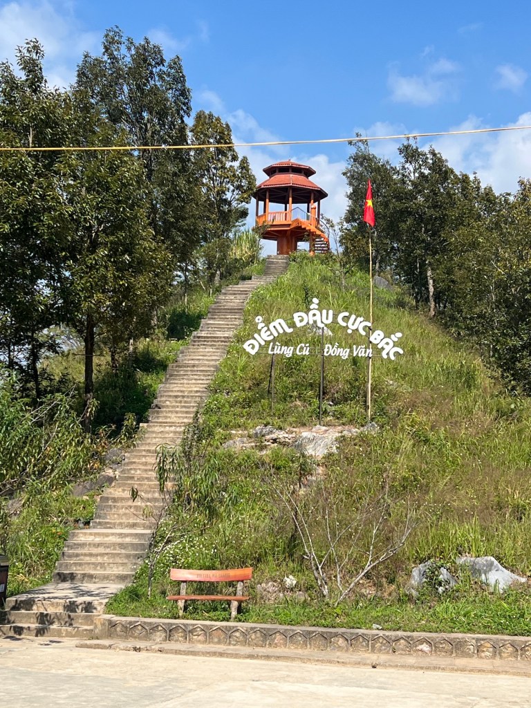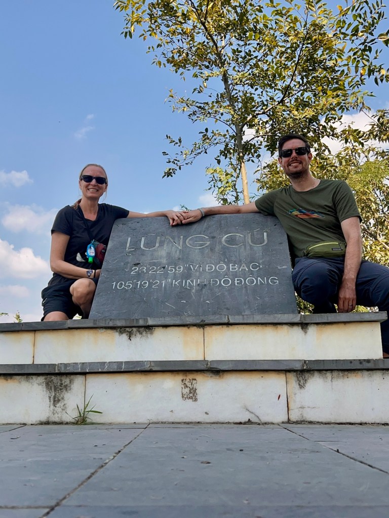Jetzt aber ab zum nördlichsten Punkt Vietnams mit Blick auf China. Die Aussicht und Serpentinen, wieder spektakulär. 40 Minuten später suchen wir mit Google Maps den Schleichweg zum nördliches Punkt. Es gibt zwar Lung Cu, den bekannten Flaggenturm, doch das ist nicht der nördlichste Punkt, nur der populärste. Wir kommen schnell an die Grenzen unseres Rollers. Der Weg ist uneben und steil. Die Krater im Boden sind so tief, dass wir uns gegen den Weg entscheiden. Etwas geknickt laufen wir erstmal die Stufen zum Flagpoint. Von oben haben wir besten Blick auf einen noch nicht fertigen Tempel, der aussieht wie der „Platz des großen Turniers“ aus Dragon Ball. ⛩️ Leider noch geschlossen. Der Flagpoint ist auch wenig befriedigend. Die Aussicht ist toll, doch es ist voll und wir haben zwar Blick auf China, aber wo China beginnt oder die Grenze ist, können wir nicht sehen. Einigen anderen Touristen geht es ähnlich und wir hören Fragen wie „Wo ist jetzt China?“ Doch aufgeben ist nicht. Christian findet noch einen vagen Weg in Richtung nördlichster Punkt.