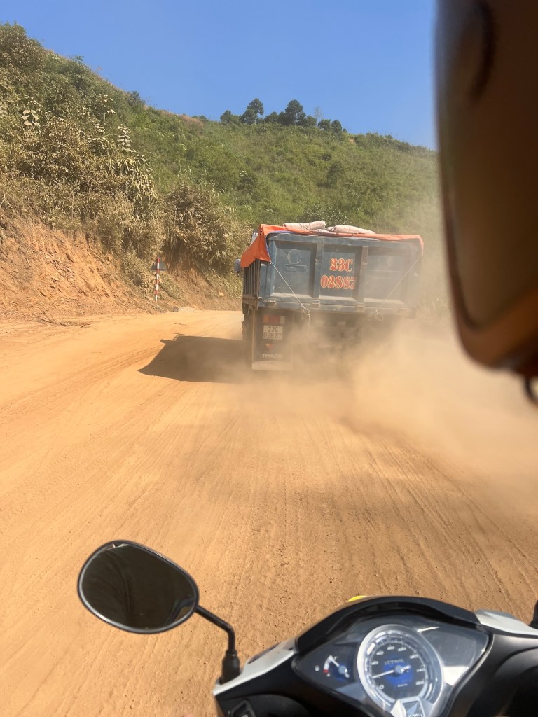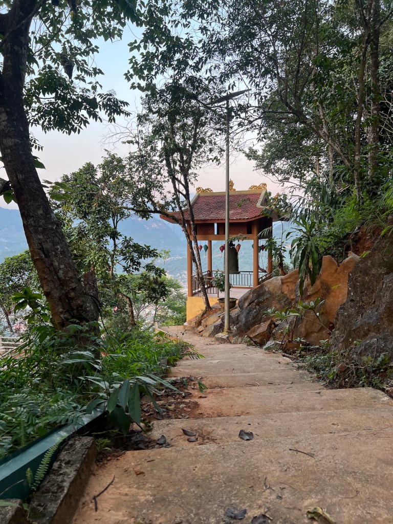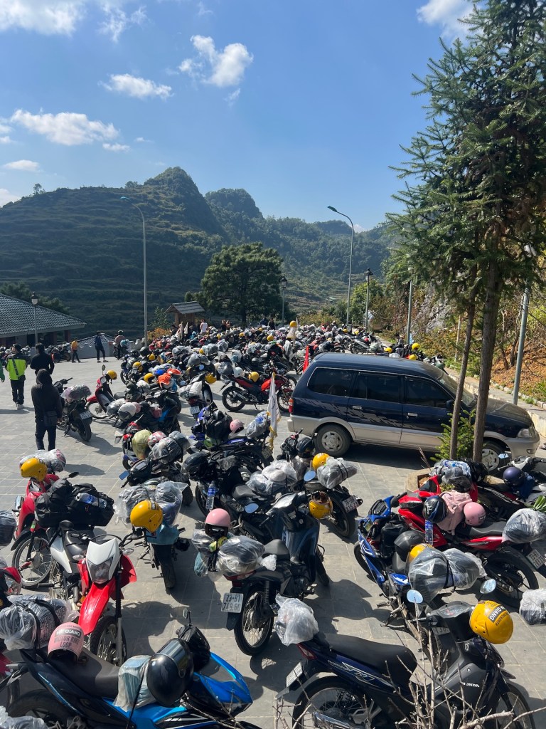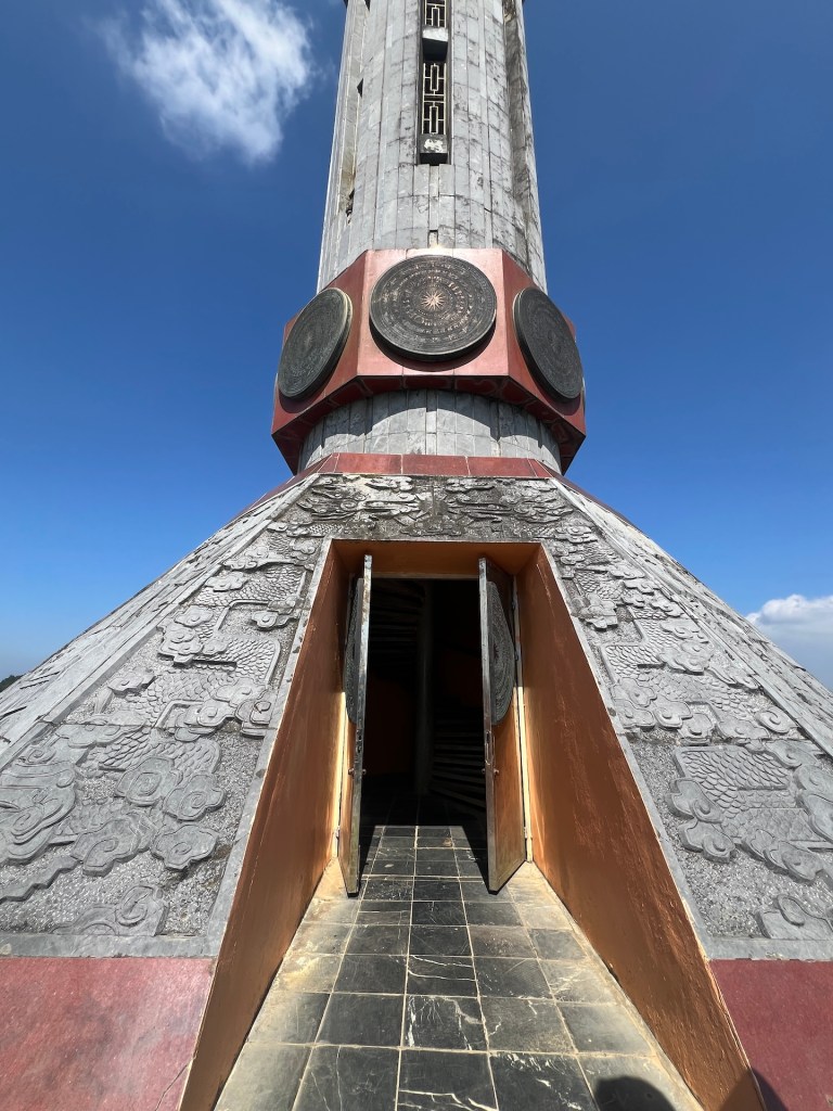 Jetzt aber ab zum nördlichsten Punkt Vietnams mit Blick auf China. Die Aussicht und Serpentinen, wieder spektakulär. 40 Minuten später suchen wir mit Google Maps den Schleichweg zum nördliches Punkt. Es gibt zwar Lung Cu, den bekannten Flaggenturm, doch das ist nicht der nördlichste Punkt, nur der populärste. Wir kommen schnell an die Grenzen unseres Rollers. Der Weg ist uneben und steil. Die Krater im Boden sind so tief, dass wir uns gegen den Weg entscheiden. Etwas geknickt laufen wir erstmal die Stufen zum Flagpoint. Von oben haben wir besten Blick auf einen noch nicht fertigen Tempel, der aussieht wie der „Platz des großen Turniers“ aus Dragon Ball. ⛩️ Leider noch geschlossen. Der Flagpoint ist auch wenig befriedigend. Die Aussicht ist toll, doch es ist voll und wir haben zwar Blick auf China, aber wo China beginnt oder die Grenze ist, können wir nicht sehen. Einigen anderen Touristen geht es ähnlich und wir hören Fragen wie „Wo ist jetzt China?“ Doch aufgeben ist nicht. Christian findet noch einen vagen Weg in Richtung nördlichster Punkt.