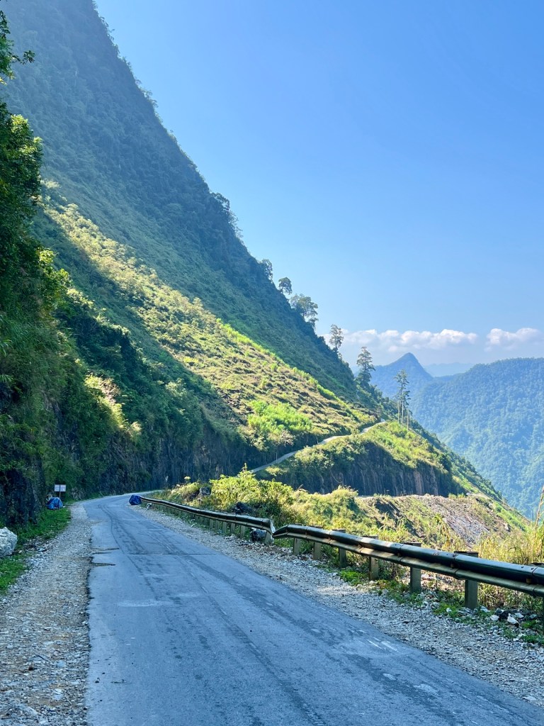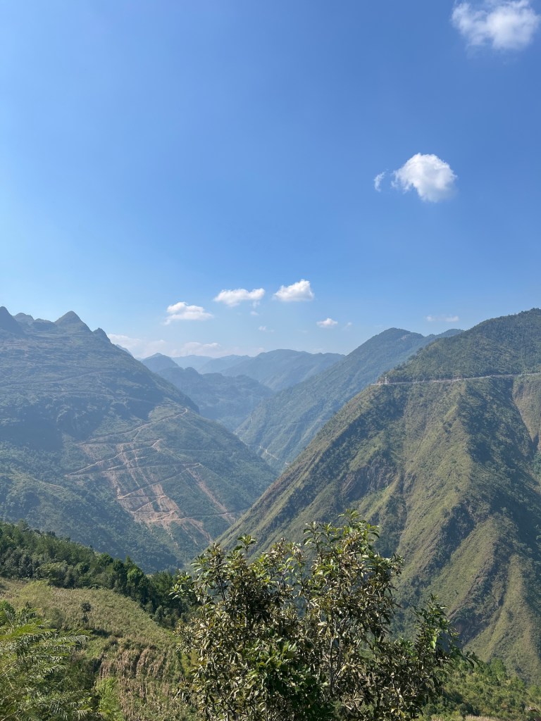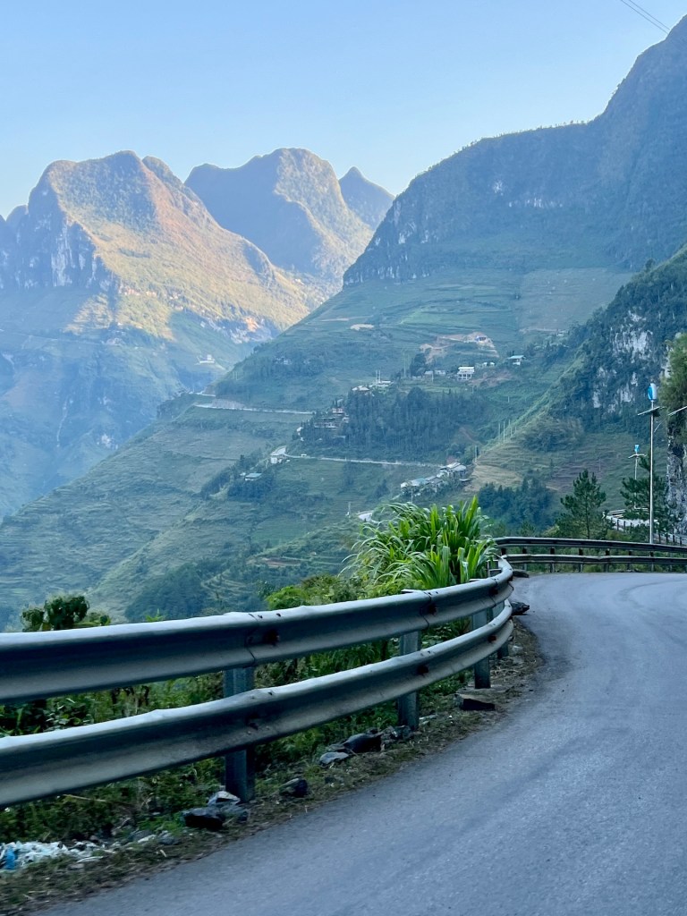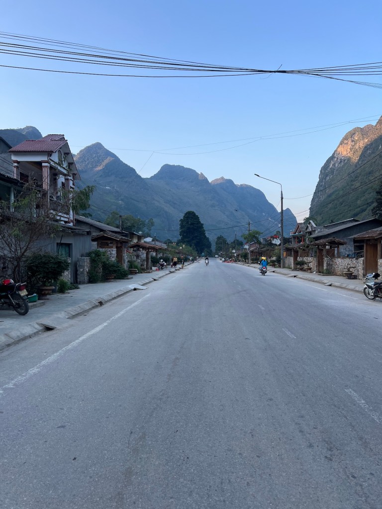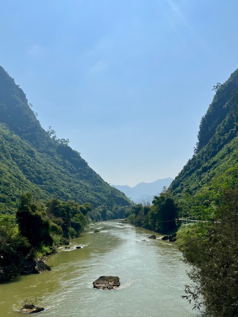 No risk, no fun. Wir fahren den verstohlenen Weg entlang. Die Straße ist eng und mit Schlaglöchern versehen. Als wir auf eine Gruppe Easyrider treffen wissen wir, das ist der richtige Weg und tadaaa wir sehen die Grenze und den Fluß der beide Länder trennt. Fühlt sich gut an. Mal schauen ob wir es im Januar 2025 auch zum südlichsten Punkt schaffen. Unser Weg führt uns noch einmal durch den schönen Ort Dong Van und wir genießen eine Pizza und leckeren Cocos-Coffee, bevor wir weiterziehen nach Meo Vac. Wir genießen die Aussicht von den gut ausgebauten Serpentinen, besuchen noch ein Denkmal, an dem wir erfahren, dass 14 Menschen bei dem Bau der Straßen gestorben sind. Dann sind wir auch schon in Meo Vac. Der Familienvater des Homestays begrüßt uns mit einem Laserschwertimitat im Kampf gegen seinen fünf jährigen Sohn. ⚔️ Das Homestay ist solide und die Zimmer gemütlich. Meo Vac in diesem Teil der Stadt wie ausgestorben. Wir laufen die Straße einmal runter, mehr gibts nicht. Wir freuen uns auf die morgige Etappe 3, wir wollen noch ein Stück zurück fahren und uns den Fluss im Tal anschauen. Der soll wie ein Fjord aussehen.