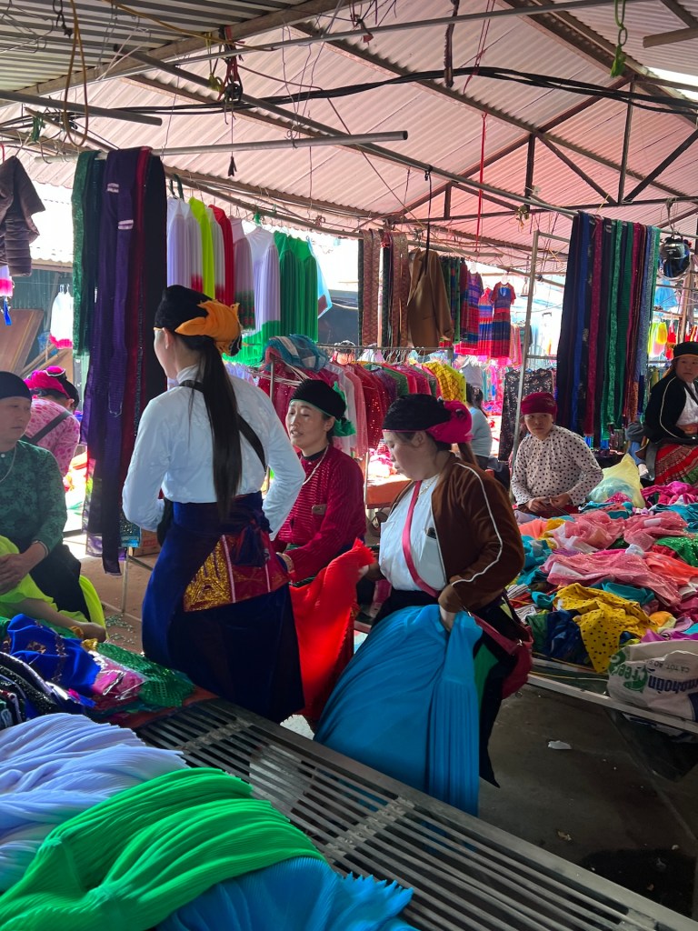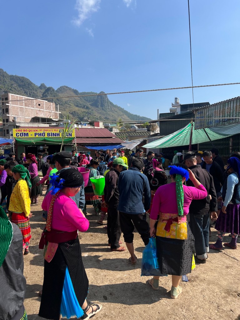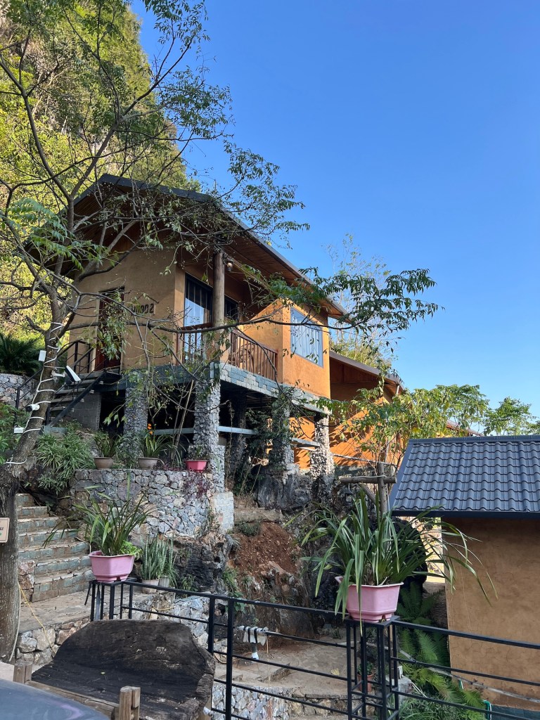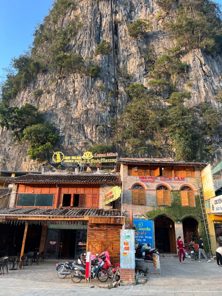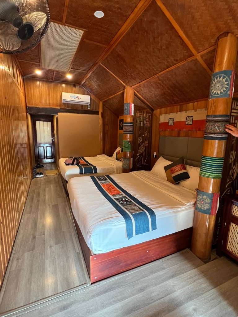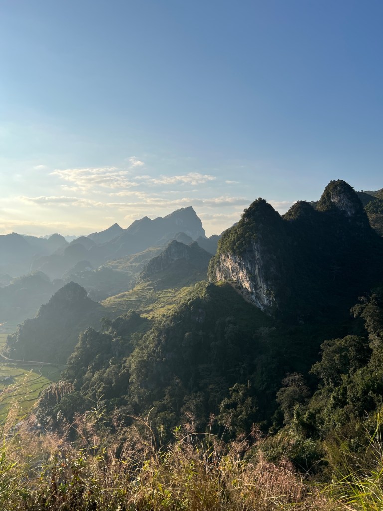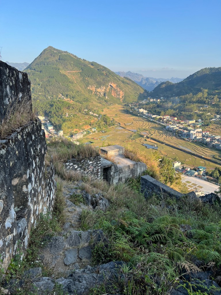 Das gebuchte Homestay in Dong Van ist mit 34 EUR das teuerste auf der ganzen Route. Das Cliffside hat Bungalows mit Sicht über Dong Van. Wir bekommen ein Familienzimmer im Hauptgebäude direkt über Küche und Aufenthaltsraum. Die Wände sind aus Bambusgeflecht und leichten Holz. Die Kissen und Holzpfähle mit bunten Mustern bestickt. Typisch für die Bergregion hier im Norden. Da die Sonne erst in einer Stunde untergeht wollen wir noch auf einen Berg steigen. Dort gibt es eine französische Festungsruine und Aussicht über ganz Dong Van. 🏔️ Der Aufstieg ist steil, doch wir haben den halben Tag gesessen und genießen es. Belohnt werden wir auf jeden Fall. Abends genießen wir vegetarische Nudeln und Frühlingsrollen inklusive Käfereinlage. Zum Glück gefunden, bevor wir ihn versehentlich gesnackt haben. Hoffentlich war er der einzige im Essen und wo sind eigentlich seine Flügel? Die Nacht im Homestay wird anstrengend. Es ist die ganze Nacht laut. Da die Wände aus dünnem Bambus bestehen, klingt es, als würde das Baby von nebenan in unserem Bett liegen und schreien. Inklusive der Mutter und dem Vater, die sich im Wechsel anmaulen. Dann gibt es einige Hundekämpfe und gegen 4 Uhr kommt noch eine Katze dazu, die im Nebenzimmer eingesperrt wurde und durchgehend schimpft. Ab 5Uhr fängt die Küche unter uns an zu Arbeiten und gegen 6Uhr ist die ganze Familie des Babys wach und räumt anscheinend um. 😑 Wenn dies die teuerste Unterkunft war, dann fürchten wir die nächsten beiden für je 16 EUR.
