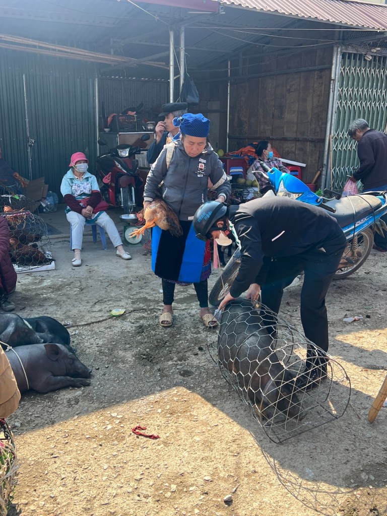 Um 07:30 Uhr stehen wir auch auf. Etappe 2 wartet. Das kleine Frühstücksbuffet weckt uns auf. Wir lernen die Familie des Homestays inklusive Welpe, Katzen und vier Kinder kennen. Die Katze, die gemauzt hat, war eingesperrt, da in letzter Zeit nachts immer Katzen vergiftet werden und die Familie sie schützen wollte. Als Entschädigung haben wir zwei große Flaschen Wasser bekommen. Die Gastgeberin erzählt uns vom traditionellen Markt in der Nähe. Christian bringt den Kids der Familie noch bei, wie man Papierflieger bastelt, dann laufen wir zum Markt. Auf dem Markt verkaufen überwiegend Bauern ihr Vieh, sowie Gemüse und Obst. Daneben gibt es noch Kleidung und Pflegemittel. Interessant der Trubel.