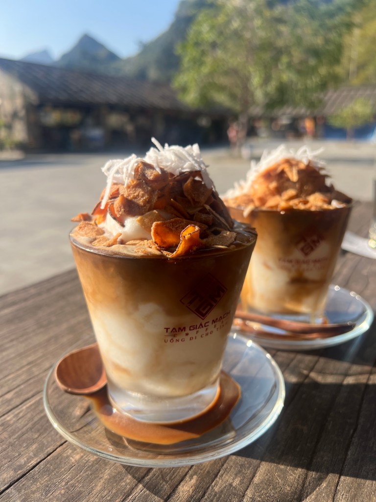 Zum Abend nähern wir uns dem zweiten Tipp von Lisa. Ein Café auf einem Berg inklusive Viewpoint. Einen leckeren Coconut-Coffee später stehen wir auf einer Burgruine und genießen die Aussicht auf Ha Giang. Als uns der Hunger kickt fahren wir wieder zum vegetarischen Restaurant und zur Feier des Tages haben sie heute vegetarisches Buffet für umgerechnet 4,37EUR pro Person. 🤤 So kann ein schöner Tag auch zelebriert werden. So lecker. Abends planen wir noch die Etappen und buchen unsere Unterkünfte auf der Route.