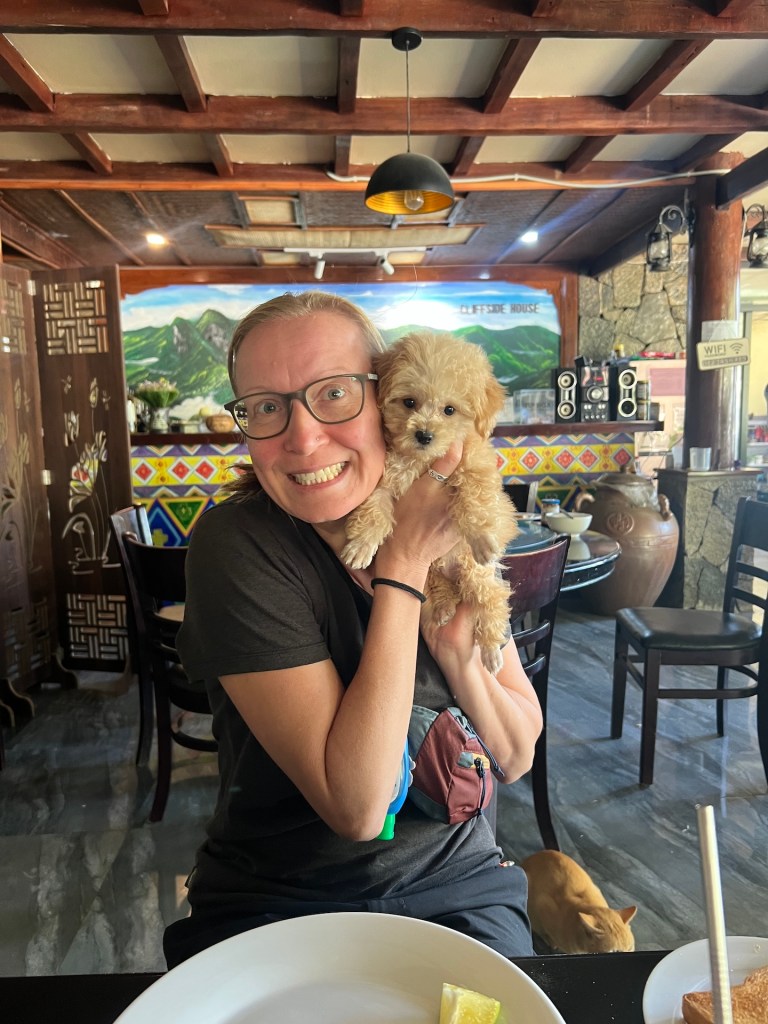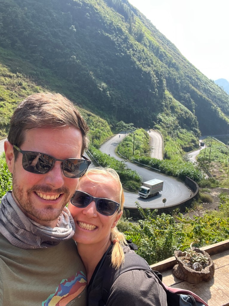 Gegen 10:30 Uhr holt uns ein Fahrer ab. Genug Zeit für ein Banh Mi an der Ecke. Yummi. Zur vereinbarten Zeit ist noch kein Fahrer hier. Gegen 10:45 Uhr auch noch nicht. Hmmm… Wir schreiben Julia. Sie kümmert sich. Schickt uns sogar den vietnamesichen Text mit dem Fahrer. Zweimal verschiebt er die Ankunft um 10 Minuten. Um 11 Uhr soll unser Bus am Central abfahren. 11Uhr kein Fahrer. 😳Julia versichert uns, dass der Bus warten wird. Für uns komisch, warum sollte er auf zwei Passagiere warten. 11:02 Uhr fährt der Minivan vor und ist voll besetzt. Darum wartet der Bus. Es ist quasi noch niemand dort. Das bestätigt sich fünf Minuten später. Wir werden ausgeladen und stehen mit 16 weiteren Reisenden an einem Office und bekommen Tickets. Weitere zwanzig Minuten fährt der Bus vor und sechs Stunden später beziehen wir unser Zimmer in Ha Giang. Stock duster, doch wir erahnen, wie bergig es hier ist. Nach einem leckeren Essen in dem einzigen echten vegetarischen Restaurant hier, besprechen wir mit Lisa (aka Chá), welche Möglichkeiten wir für den Loop haben. Es wird klar, dass Jana nicht allein fahren darf, da sie keinen Motorradführerschein hat. Bei Kontrolle kostet es etwa 80EUR. Da wir gern zusammenfahren, bleibt es bei einem Gefährt. Wir müssen nur noch klären welches.
