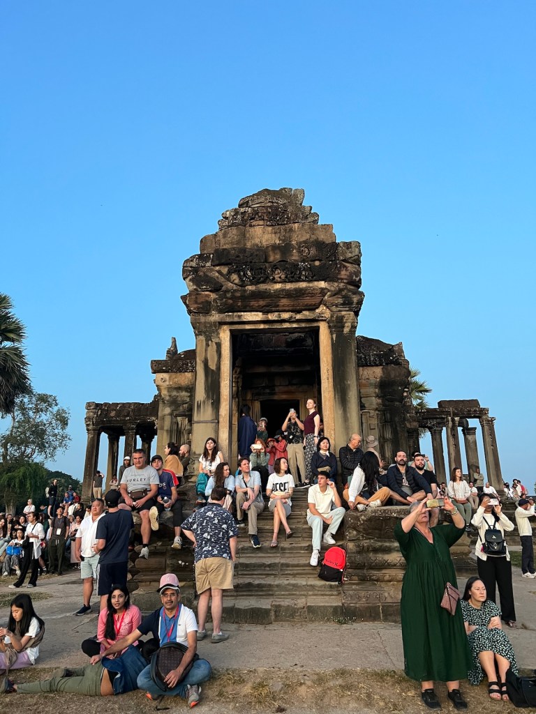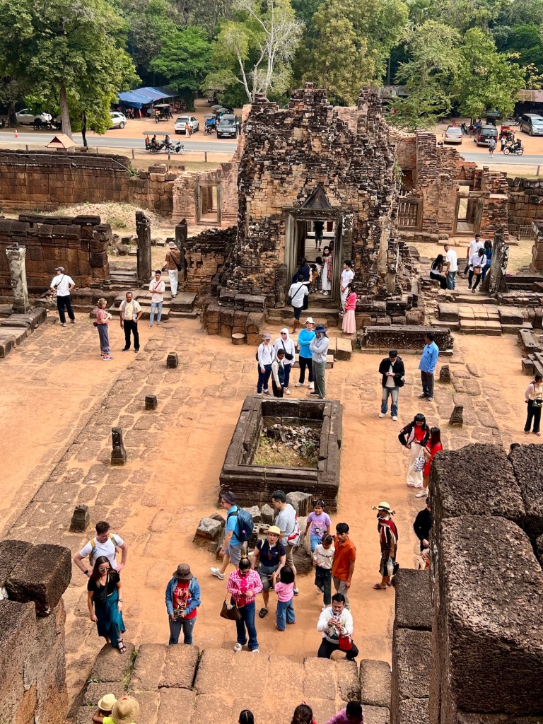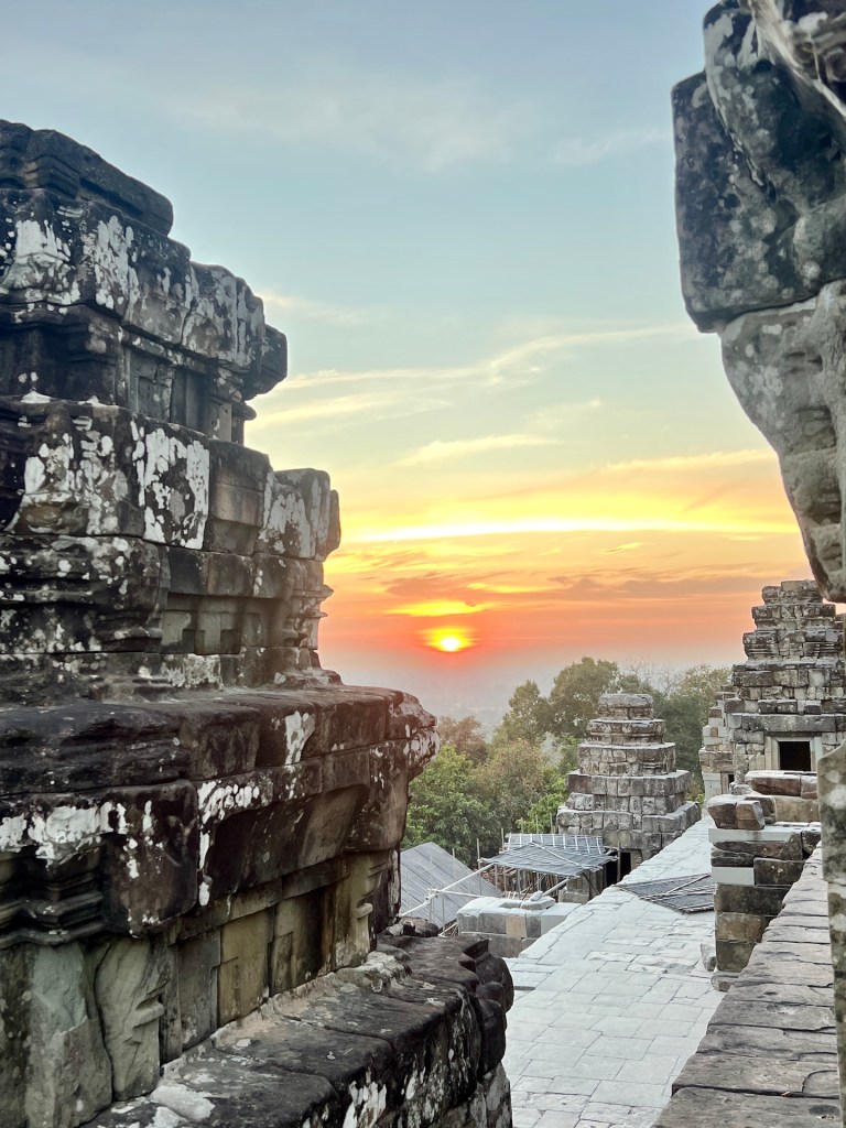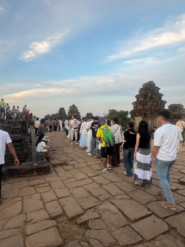 Die zweitägige Tempeltour endet auch für uns mit dem Besuch des Phnom Bakheng. Allerdings ist der Verkehr grausig und wir kommen erst 20 Minuten vor dem Sonnenuntergang an. Das heißt für uns, im Slalom durch die Touristenmassen sprinten. Vor dem Tempel stehen wir dann noch eine gewisse Zeit in der Schlage vor der Treppe die wir auch in einem Atemzug meistern. Wir schaffen es vor dem Sonnenuntergang nach ganz oben, werfen einen Blick und entscheiden uns dann lieber ein Neujahrsgespräch mit Sonja und Daniel zu führen, schön dass es euch mittlerweile besser geht 💕
