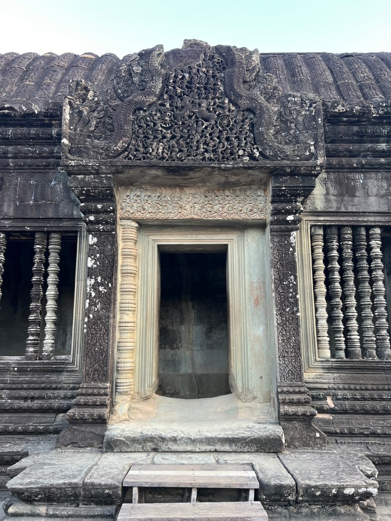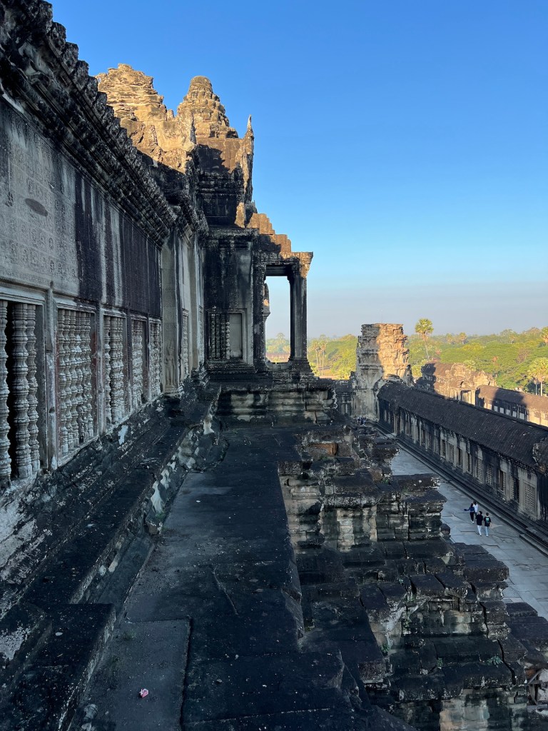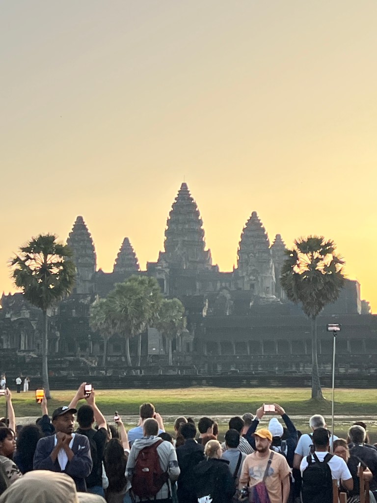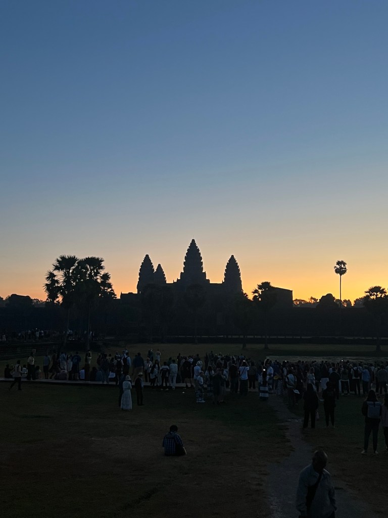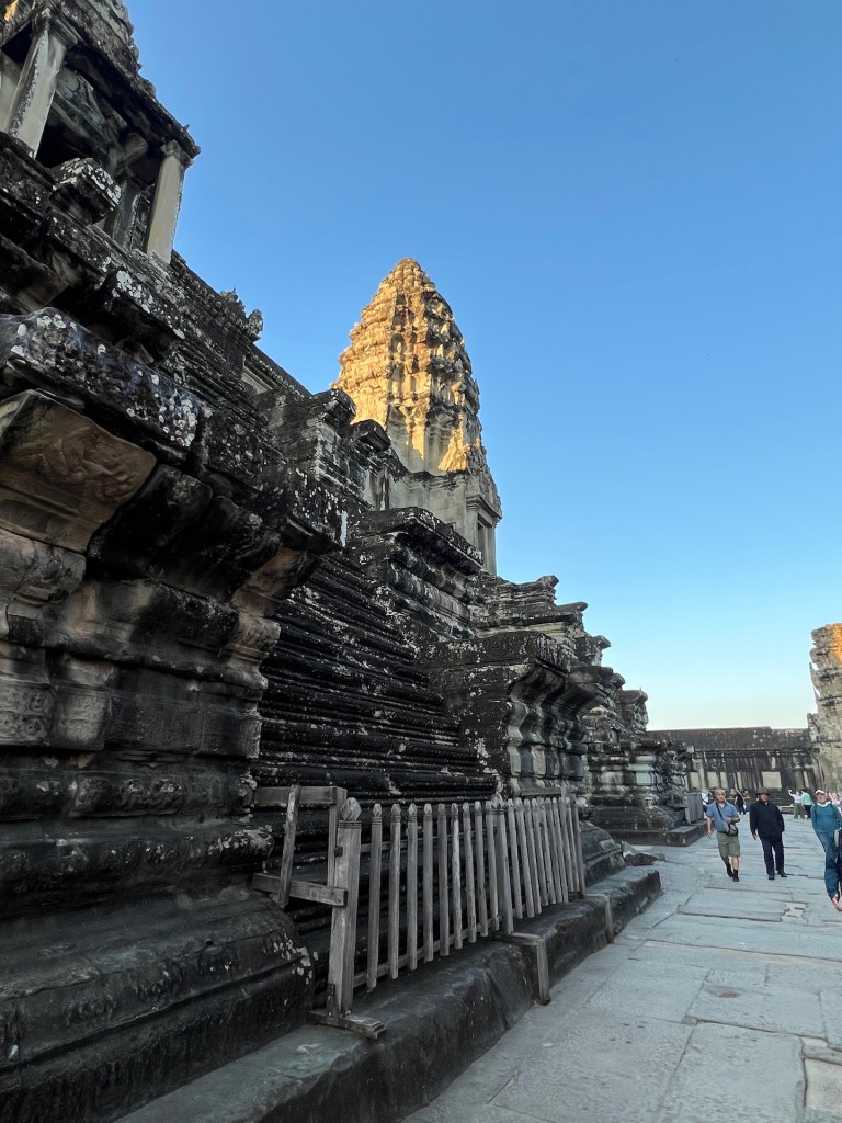 Um kurz nach vier hält eine Rikscha, zwei Touristen sitzen bereits auf einer Bank. Man zeigt uns eine Liste auf dem Handy, dann steigen wir ein. Es geht durch unbefestigte Gassen, schmale Straßen und über Stock und Stein. Dann erreichen wir die Hauptstraße und damit auch den wartenden Bus. Als alle Platz genommen haben stellt sich Mr. Teah, unser Tourguide, vor. Man hat den Eindruck, er wäre als einziger bereits wach. 😴 Bevor es zum Sonnenaufgang in die Tempelanlage Angkor geht, machen wir noch einen Halt am Ticketoffice. Jetzt aber los. Die Straße zur Anlage ist breit und gut ausgeleuchtet, ein interessanter Kontrast zu den Straßen der Stadt. Dann sind wir endlich da, wir verlassen den Bus, sammeln uns kurz und dann geht es auch schon in völliger Finsternis zu Fuß weiter. Unser Guide hat als einziger eine gute Taschenlampe und sucht den Weg akribisch nach krabbelnden oder schlängelnden Tieren ab. 🐍 🦂