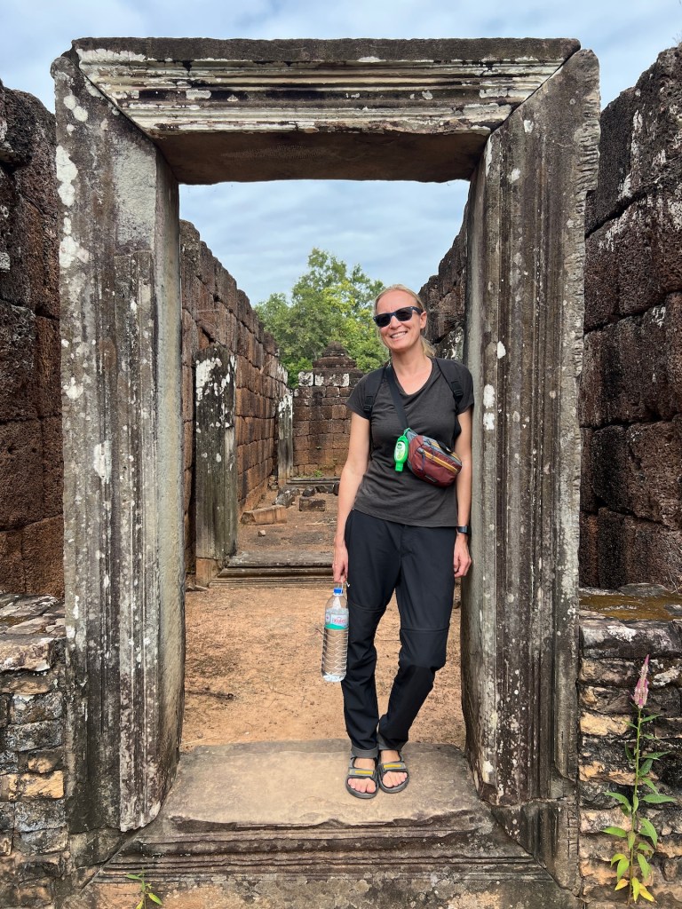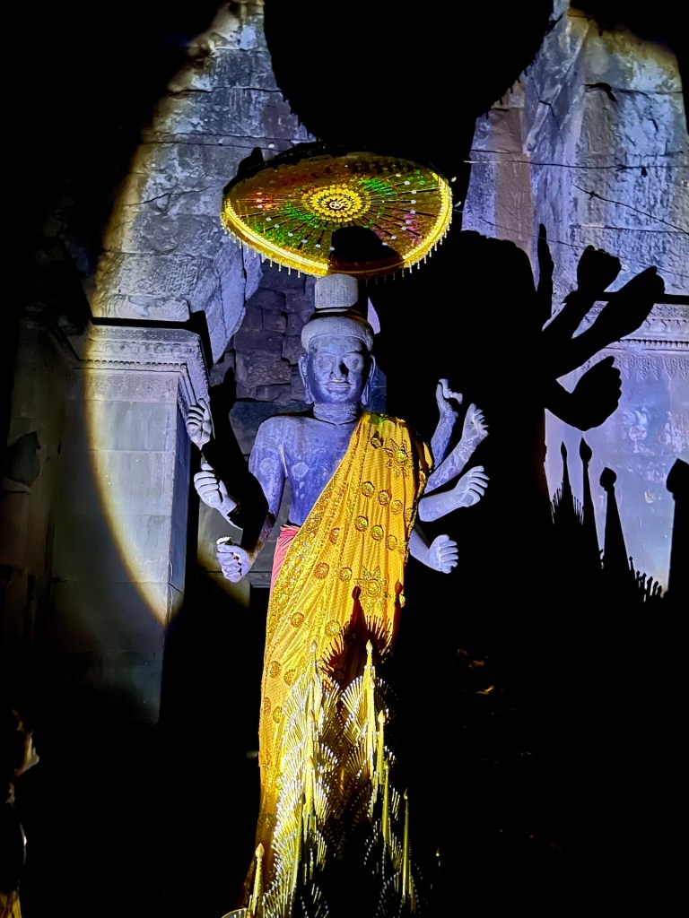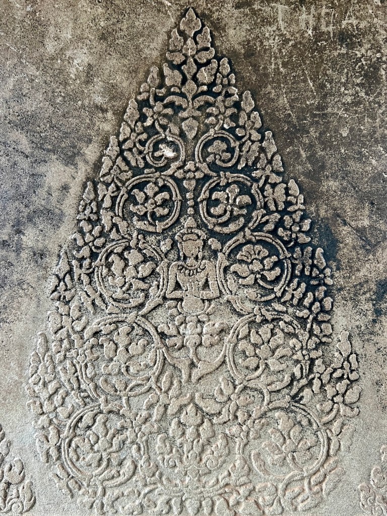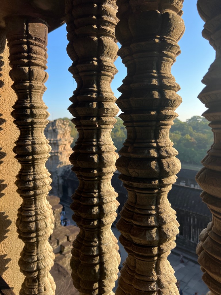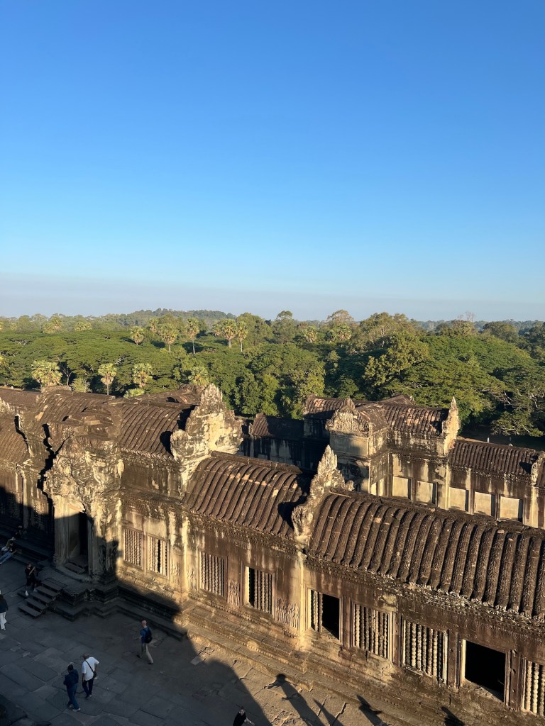 Um kurz nach vier hält eine Rikscha, zwei Touristen sitzen bereits auf einer Bank. Man zeigt uns eine Liste auf dem Handy, dann steigen wir ein. Es geht durch unbefestigte Gassen, schmale Straßen und über Stock und Stein. Dann erreichen wir die Hauptstraße und damit auch den wartenden Bus. Als alle Platz genommen haben stellt sich Mr. Teah, unser Tourguide, vor. Man hat den Eindruck, er wäre als einziger bereits wach. 😴 Bevor es zum Sonnenaufgang in die Tempelanlage Angkor geht, machen wir noch einen Halt am Ticketoffice. Jetzt aber los. Die Straße zur Anlage ist breit und gut ausgeleuchtet, ein interessanter Kontrast zu den Straßen der Stadt. Dann sind wir endlich da, wir verlassen den Bus, sammeln uns kurz und dann geht es auch schon in völliger Finsternis zu Fuß weiter. Unser Guide hat als einziger eine gute Taschenlampe und sucht den Weg akribisch nach krabbelnden oder schlängelnden Tieren ab. 🐍 🦂