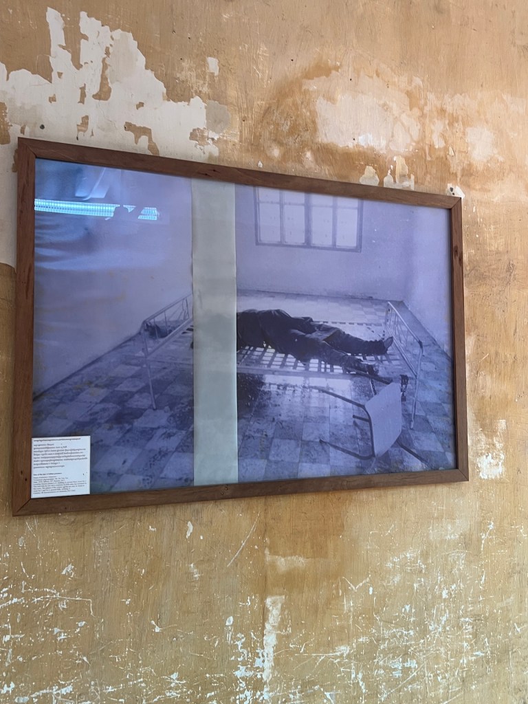 Wir haben bereits während der Tempeltour eine Menge über die Geschichte Kambodschas gelernt. Heute heißt es für uns: stark bleiben. Wir besuchen das Tuol-Sleng-Genozidmuseum. Bereits von außen wirkt das alte Schulgebäude bedrückend. Die Mauern sind hoch, Stacheldraht macht das Überqueren unmöglich. Das von den Roten Khmer zum Gefängnis umfunktionierte Gymnasium ist auch unter der Bezeichnung S-21 bekannt. Unter der Leitung von „Genosse Duch“ wurden hier zwischen 1976 und 1979 14.000 Menschen zum Tode verurteilt. Die Verbrechen waren oft frei erfunden und die Geständnisse durch Folter erzwungen. S-21 existierte zuvor an einem anderen Ort, so dass insgesamt 18.000 Menschen zum Opfer dieser Institution wurden. Wir haben uns zum Glück entschieden das Museum mit einem Audio-Guide zu besuchen. So können wir gut verstehen welche Verbrechen hier im Auftrag der Roten Khmer durchgeführt wurden und außerdem immer mal wieder an die frische Luft gehen, wenn uns die Eindrücke zu viel werden. Gebäude B des Gefängnisses ist im Erdgeschoss für die Ausstellung von Bildern umgebaut worden, in den darüber liegenden Etagen sind die Gruppen- und Einzelzellen noch erhalten. Hier und da zeugen noch immer Blutspuren von den letzten Tötungen die das Personal, vor der Befreiung durch vietnamesische Truppen am 07.01.1979, durchführte.