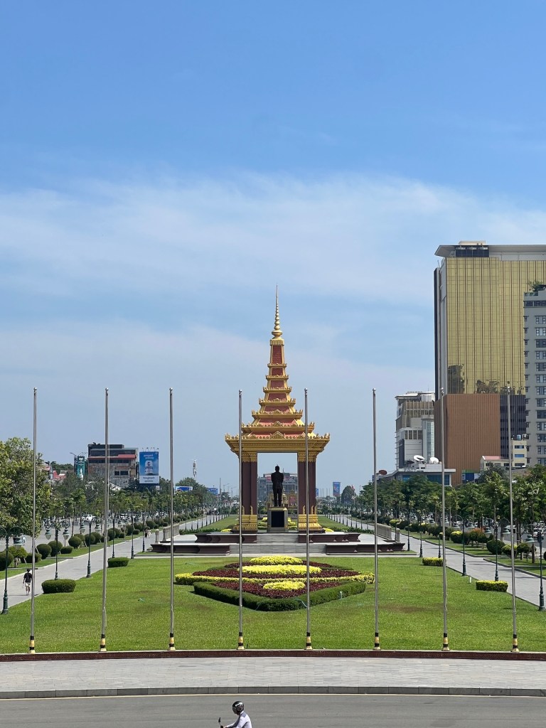 Nach getaner Arbeit machen wir uns jetzt auf ins Vergnügen. Das bedeutet in unserem Fall, wir spazieren durch die ganze Stadt. Dabei kommen wir über den Preah Sihanouk Blvd. vorbei am Unabhängigkeits Monument, der Statue seiner Majestät Preah Bat Samdech Preah Norodom Sihanouk und dem Drachenbrunnen, der eigentlich den Schlangengott zeigt, vorbei. Zwecks Stärkung und um der Sonne kurz zu entgehen landen wir in einem coolen Café bevor wir uns auf den Weg zum Fluss machen.