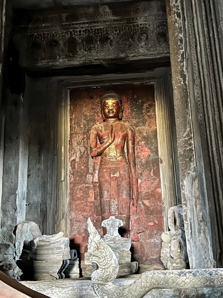 Wir passieren die Außenmauern des berühmten Angkor Wat und betreten das Heiligtum. Natürlich können wir immer noch nichts sehen, allerdings macht es den Anschein als liefen wir über eine Art Rasen. Unser Guide empfiehlt uns den besten Platz für die besten Fotos, gleich da vorne am Teich vor dem Tempel. Tolle Spiegelungen. Mhm, danke. Wir entscheiden uns etwas weiter entfernt an der Bibliothek Platz zu nehmen und uns nicht in das Gemenge zu stellen. Während wir jetzt auf den Sonnenaufgang warten und eigentlich die Ruhe des Moments genießen wollen, strömen immer mehr Zuschauer aufs Gelände. Wir waren natürlich nicht davon ausgegangen alleine zu sein, aber die Menge an Menschen hatten wir auch nicht erwartet. Nach und nach beginnt die Dämmerung und wir genießen einen wolkenfreien Sonnenaufgang. Am schönsten soll der übrigens am 21.März sein. Dann geht die Sonne in einer Linie über dem zentralen Turm des Tempels auf und wenn man Glück hat genießt man als einer von etwa 8000 Menschen einen wolkenfreien, tieforangenen Sonnenaufgang. 🌅