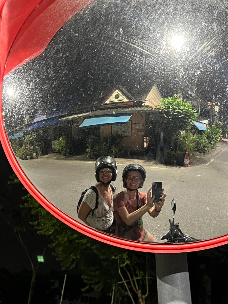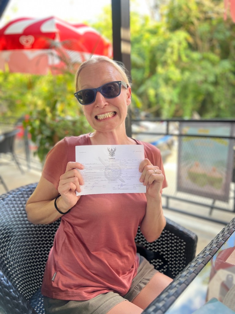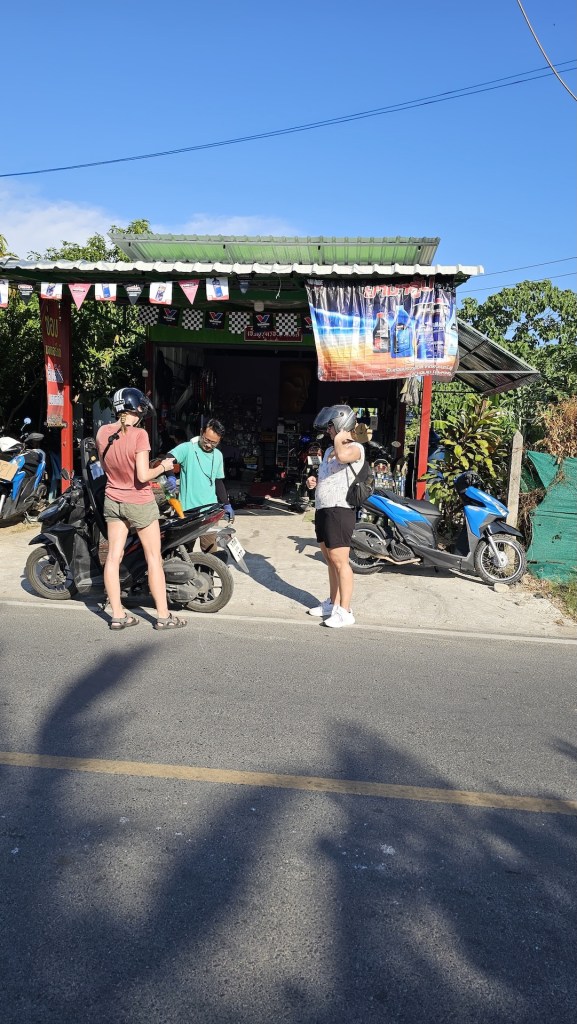 Da Ari und Alex nicht fahren wollen und ein Taxi zu teuer ist, fahren wir beide. Wir sind uns bewusst, dass Jana hier offiziell nicht fahren darf, doch bisher haben wir gerade auf den Touristeninseln die Erfahrung gemacht, dass die Polizei entspannt ist. Die Hotelbesitzerin durchblickt ihr eigenes Chaos dann auch irgendwann und so haben wir nach einer halben Stunde bangem Suchen zwei Airblades. Jana und Alex sind bereits in Griechenland mit dem Quad zusammen gefahren. Die neue Combo mit Christian und Ari fährt voraus. Woohooo. 🥳 Wir lieben es. Der Verkehr ist dicht, aber machbar. Nach ca. zehn Minuten wird Christian von einem Polizisten rausgezogen und Jana gleich mit. Shit! Pflichtbewusst wie er ist, bekommt Jana einen Strafzettel den sie reumütig annimmt. Zufälligerweise ist das Polizeirevier, wo wir die Zeche bezahlen können, direkt gegenüber. Der freundliche Polizist sagt uns, dass wir zum Schalter 4 müssen. Gesagt, getan. Wir werden auch schon erwartet und dürfen direkt ran. 1000 Hosentaschen Baht (27 EUR) später, hält Jana ihre 24h Lizenz zum Fahren in den Händen. Eigentlich ein Strafzettel, aber hier darf sie damit nun offiziell den ganzen Tag Moped fahren.