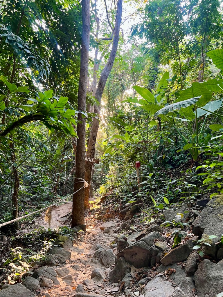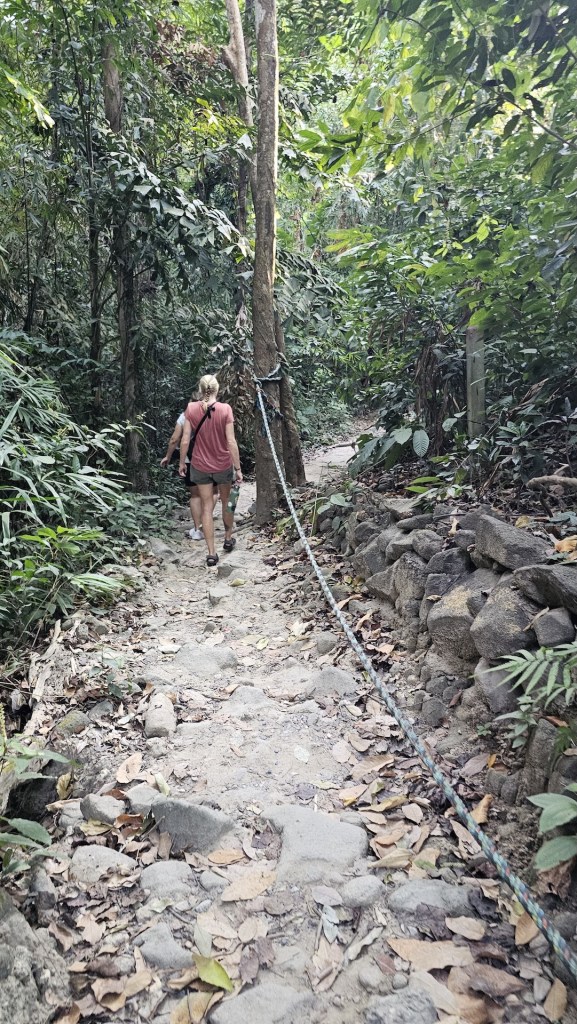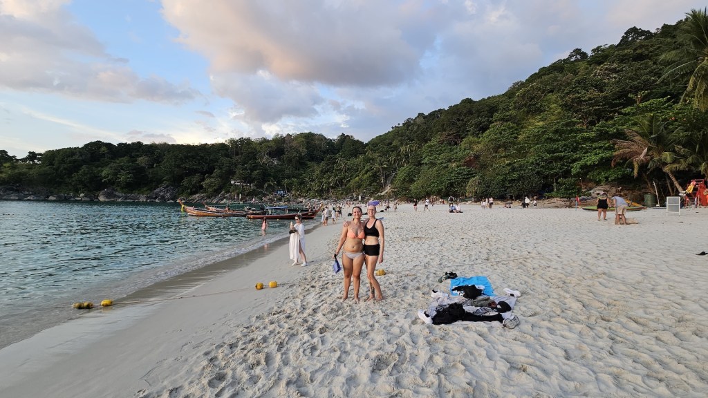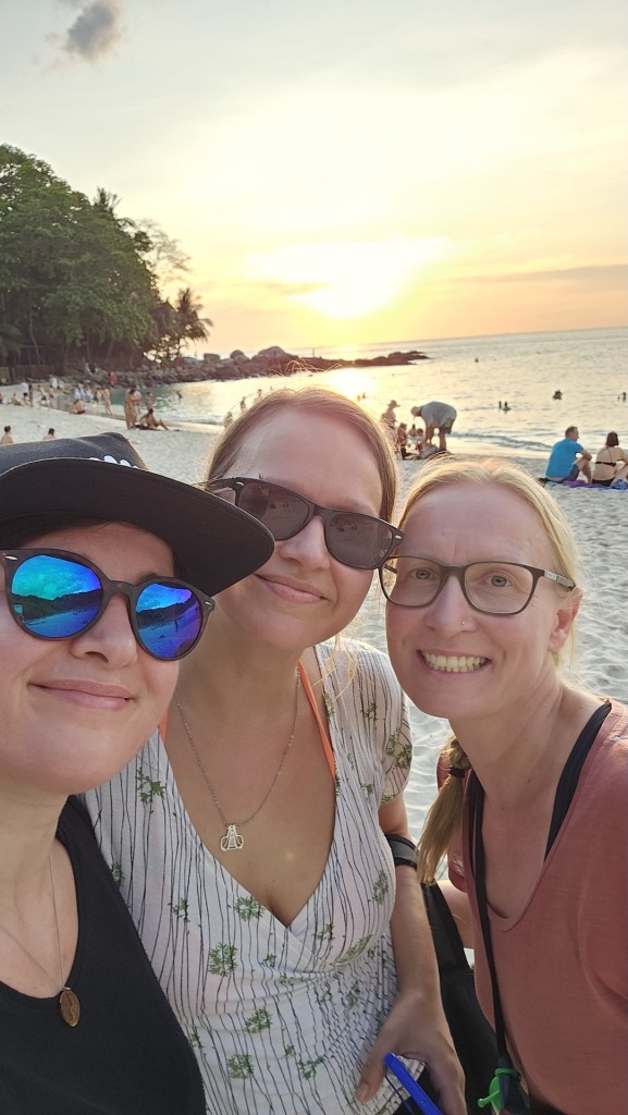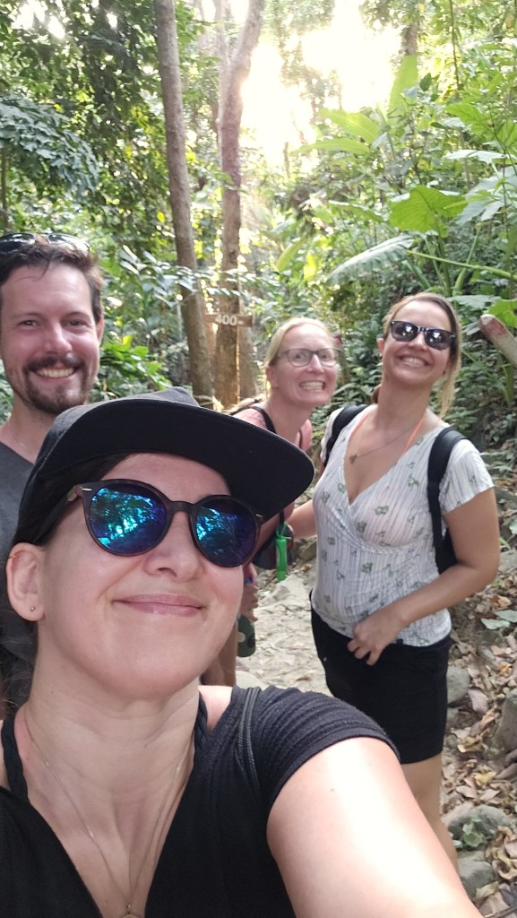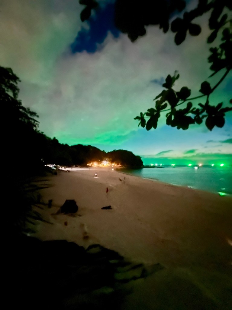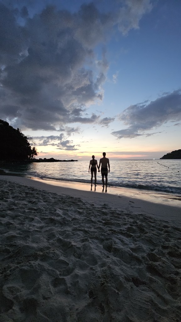 Nach einer weiteren halben Stunden sind wir am Freedombeach. Ein beschwerlicher Pfad durch den Dschungel führt uns ein paar Meter nach unten direkt zum Strand. Auf halbem Wege merken wir, dass wir unserer Sachen oben liegen lassen haben. Wir schnucken darum, wer gehen muss. Es ist Christian, der sich bei schwüler Hitze wieder den Berg hochquält. Bei Sonnenuntergang kommen wir endlich an. Das Wasser ist kristallklar und angenehm kühl. Wir verweilen, bis die Sonnen gänzlich untergegangen ist. Beobachten wie nach und nach alle Gäste den Strand verlassen. Einige per Boot, andere nehmen den beschwerlichen Weg durch den Dschungel. Wiederrum andere die Treppe und den Hauptweg. Beim Floaten im Wasser sehen wir hinter dem Berg der Bucht ein Wetterleuchten. Wir sind entspannt und genießen. Uns wird bewusst, dass wir vorerst ein letztes Mal das tropische Meer genießen.