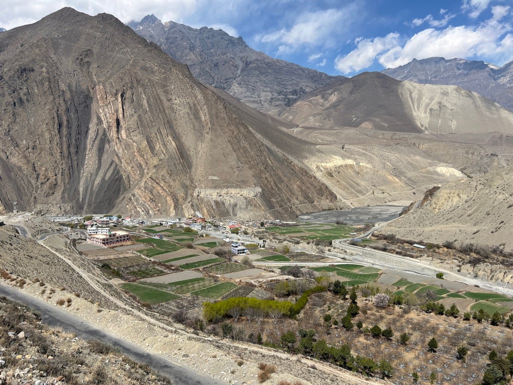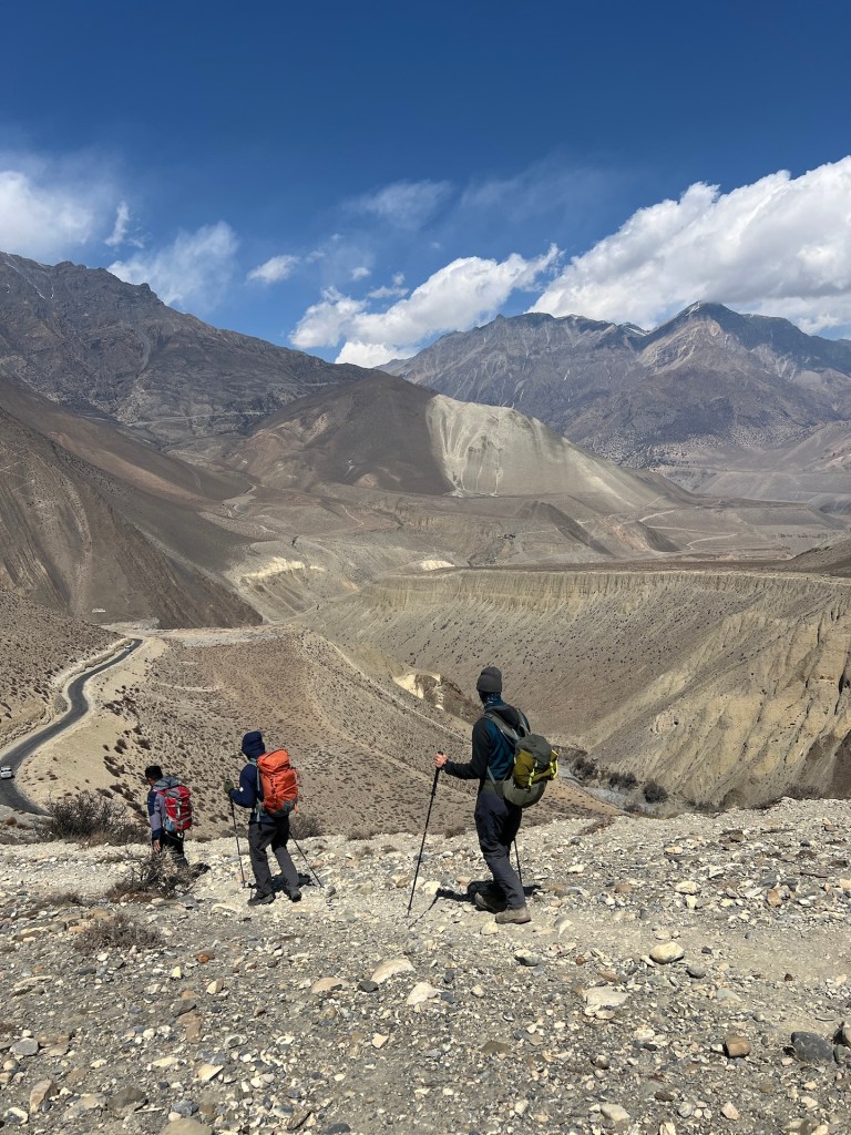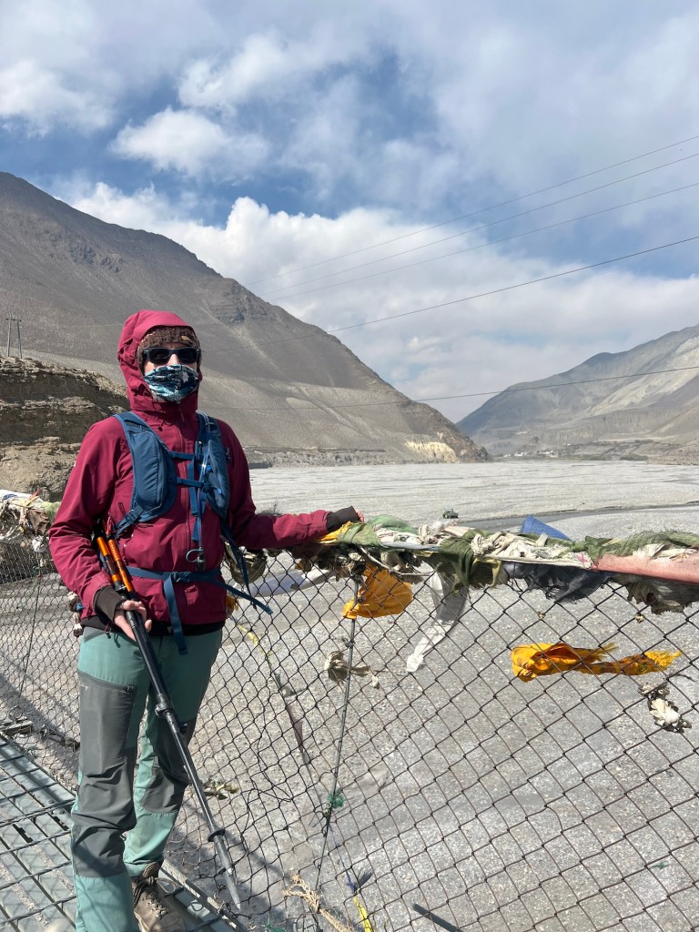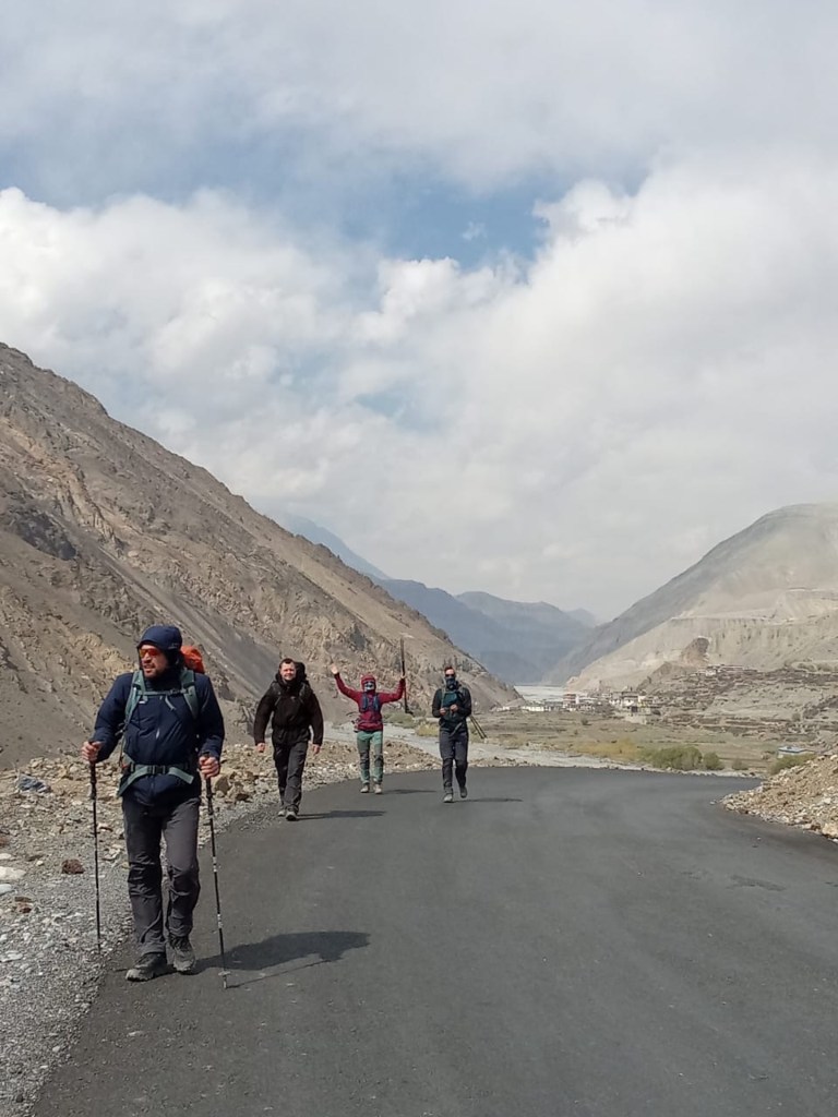 Heute haben wir den 21.03.2025, es sind kuschlige -11Grad draußen und wir wandern weiter ab. Wir wanden circa 20 Kilometer von Muktinath (3800m) über Kagbeni (2850m) nach Jomsom (2770m). Shera wäre den Weg gern mit Bus gefahren, da wir die meiste Zeit an der Straße laufen müssen und es zwischendurch extrem windig werden wir. Doch wir wollen laufen. Allen geht es gut, wir sind fit und niemand hat Kopf- oder Muskelschmerzen. Einzig unser Porter Lhakpa genehmigt sich eine Fahrt mit dem Bus. Das hat er verdient.