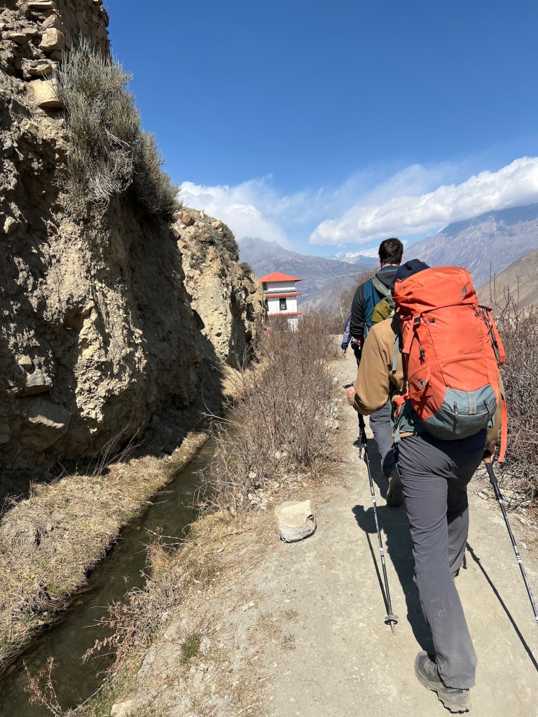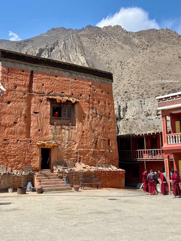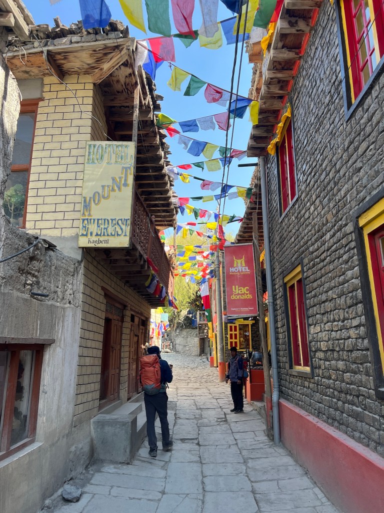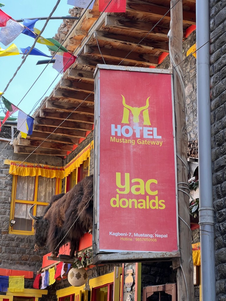 Wir sind froh, dass wir uns für die Wanderung entschieden haben, da wir eine Weile durch die Bergdörfer wandern und nochmal einen anderen Einblick in die Kultur Nepals gewinnen können. Wieder ist es sonnig und der Himmel blau. Da hatte Tobi recht behalten. Wir waten durch matschige Wiesen, springen über Flüsse, sehen einige Felder und skurrile Skulpturen. Wir haben über den Pass auch Manang verlassen und genießen nun die Aussicht auf Mustang. Die Straßen sind wenig befahren und wir kürzen die Serpentinen mit steilen, steinigen Wegen dazwischen ab. Durch den starken Wind, sind wir wieder vermummt und fühlen uns wie Wüstenkrieger. Vier Stunden später erreichen wir unser Zwischenziel Kagbeni (2850m). Hier schauen wir uns eine der ältesten Tempel Mustangs an. Naja und nehmen unser Mittagessen zu uns. Aber nicht irgendwo. Sondern im einzig wahren YacDonalds. Nen leckeres HappyMeal. Vegetarisch versteht sich.