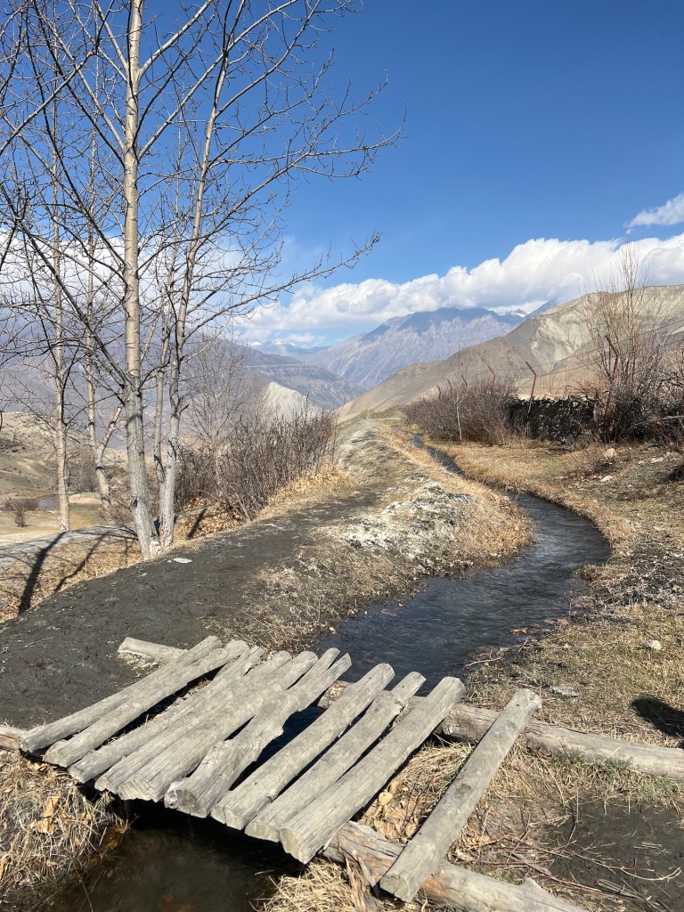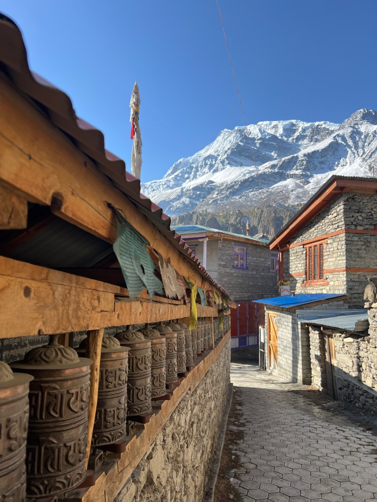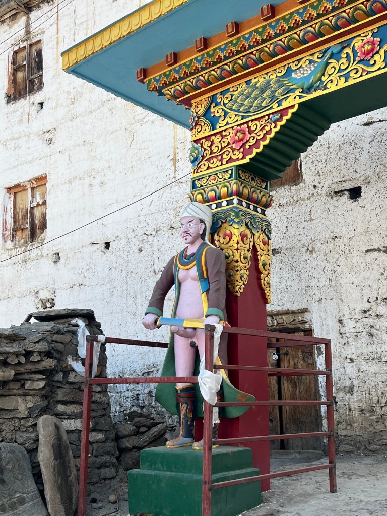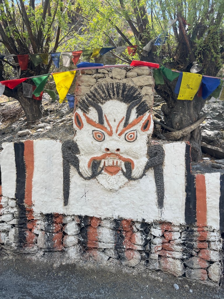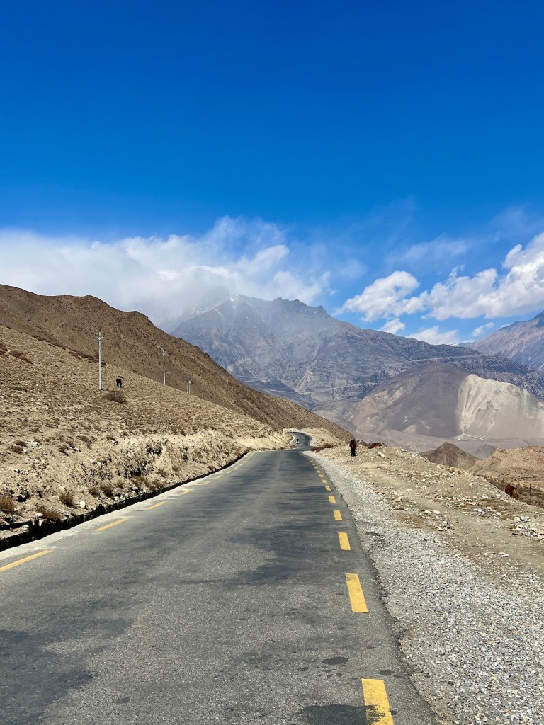 Wir sind froh, dass wir uns für die Wanderung entschieden haben, da wir eine Weile durch die Bergdörfer wandern und nochmal einen anderen Einblick in die Kultur Nepals gewinnen können. Wieder ist es sonnig und der Himmel blau. Da hatte Tobi recht behalten. Wir waten durch matschige Wiesen, springen über Flüsse, sehen einige Felder und skurrile Skulpturen. Wir haben über den Pass auch Manang verlassen und genießen nun die Aussicht auf Mustang. Die Straßen sind wenig befahren und wir kürzen die Serpentinen mit steilen, steinigen Wegen dazwischen ab. Durch den starken Wind, sind wir wieder vermummt und fühlen uns wie Wüstenkrieger. Vier Stunden später erreichen wir unser Zwischenziel Kagbeni (2850m). Hier schauen wir uns eine der ältesten Tempel Mustangs an. Naja und nehmen unser Mittagessen zu uns. Aber nicht irgendwo. Sondern im einzig wahren YacDonalds. Nen leckeres HappyMeal. Vegetarisch versteht sich.