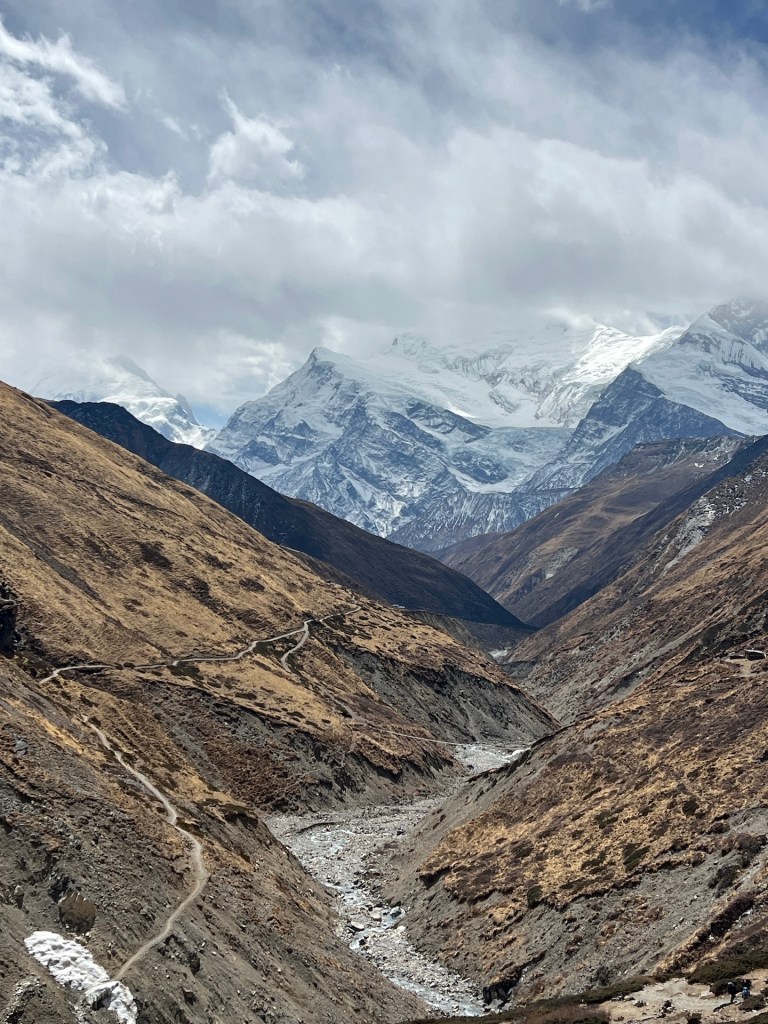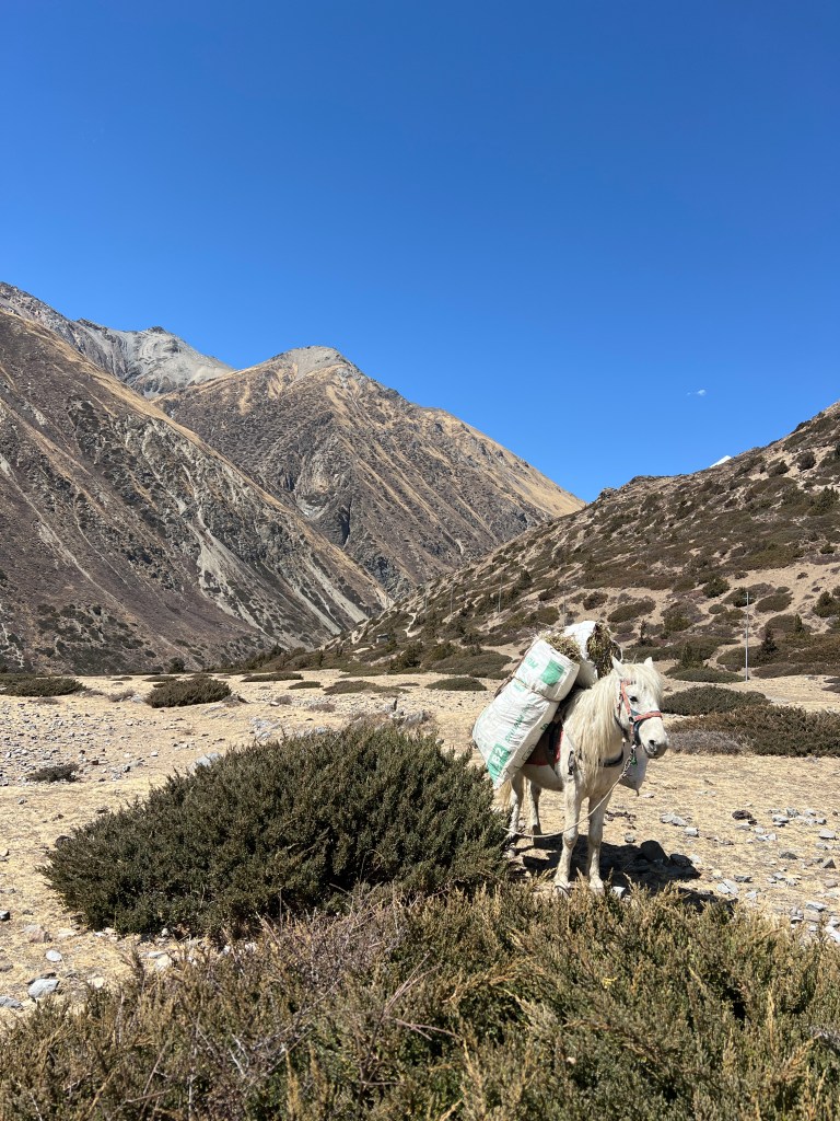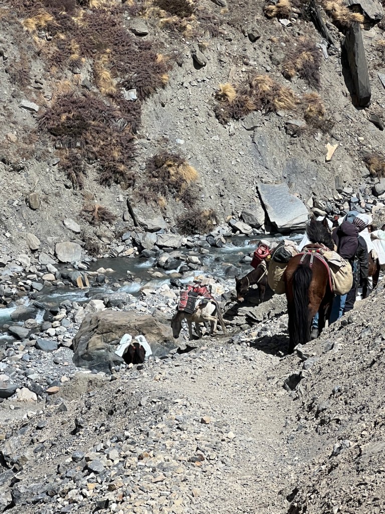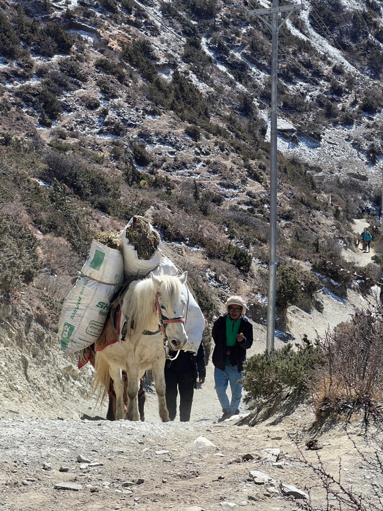 Von den 300 hm laufen wir 200 hm direkt zum warm werden, um überhaupt aus Manang rauszukommen. In dem Ort Tanki Manang sehen wir das erste Schild vom Thorong La Pass. Wir erreichen einen schmalen Bergpfand und treffen auf die ersten Lastenpferde, die die nächsten Orte mit Lebensmittel, Gasflaschen etc. versorgen. Über einen steilen Teil des Weges verlassen wir das Tal und sehen vor uns in der Ferne unseren Pass. Der schmale Pfad zieht sich wie eine Schlange entlang des Hangs. Um nach Yak Kharka zu kommen müssen wir durch Gunsang auf 3900 m durch. Hier genehmigen wir uns eine Pause mit phantastischer Aussicht, die wir bei leckerem Nak-Käse, der Yak-Käse heißt, frischem Obst und Keksen. Nak und Yak ist in unserer Expedition-Gruppe ein Runninggag. Denn, die männlichen Tiere heißen Yak und die weiblichen milchgebeten Nak. Woher also kommt Yak-Käse? 😆 Das frische Obst tragen Shera und Lhakpa seit Kathmandu mit. Wahnsinn.