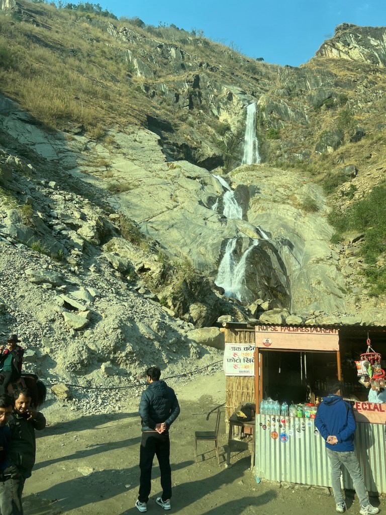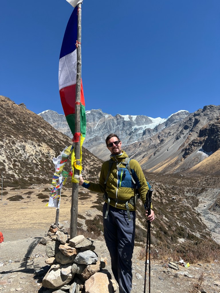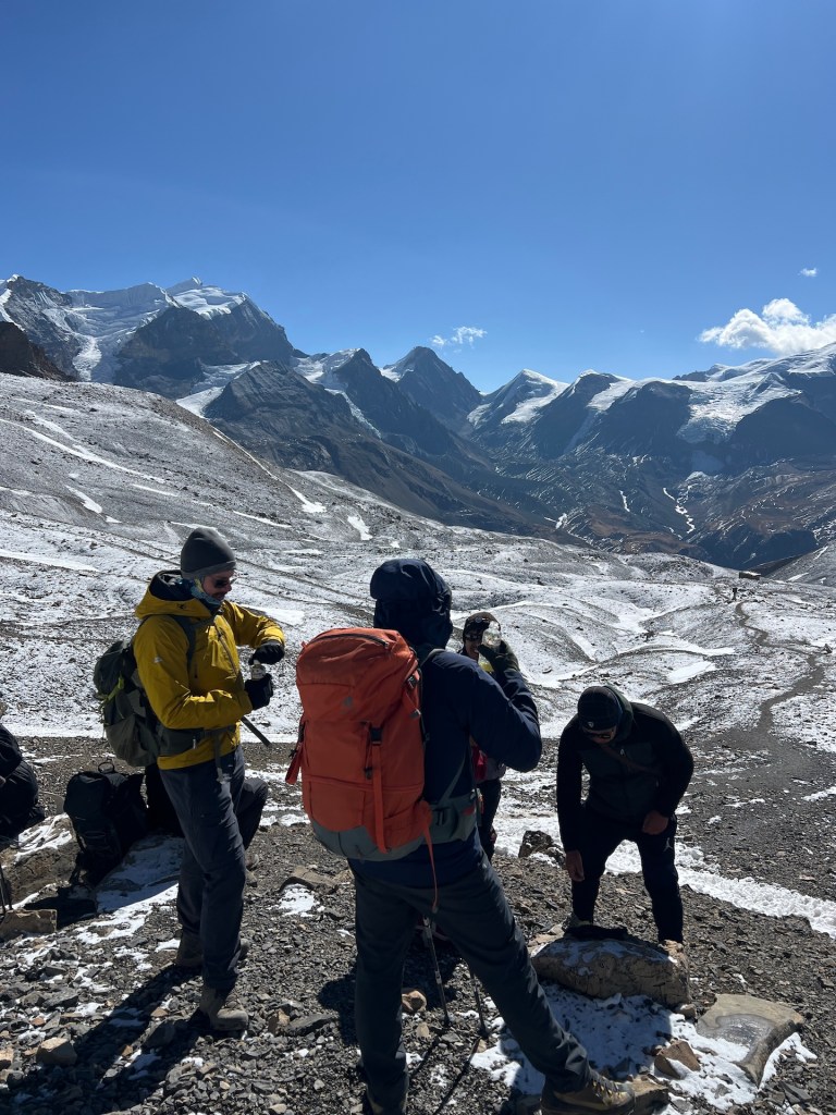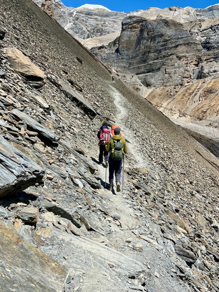 Am nächsten Morgen geht es Jana schon viel besser. Tobi und Christian geht es ebenfalls super. Heute steht die Wanderung von Yak Kharka (4018m) etwa 6,5km und 440 hm bis zum Thorong Base Camp (4550hm) an. Der letzte Ort vor dem Pass. Gegen 9Uhr wandern wir etwas verspätet los. In den Felswänden sehen wir mehrere eingefrorene Wasserfälle und ein paar „Blaue Schafe“, die eigentlich braun sind. Wir überquere unser erstes Minischneefeld und klettern einen steilen Abhang zum Fluss hinunter, nur um direkt danach die doppelte Höhe im Zickzack wieder hinauf zu wandern. An einem kleinen Teehaus pausieren wir und snacken ein bisschen Obst. Gegen Mittag ziehen wir weiter durch ein gefährliches Geröllfeld. Shera weißt uns an, den Hang und das Feld genau zu beobachten. Bei jeder Bewegung im Feld und sei es ein noch so winziger Stein heißt es Rufen und in Deckung gehen. Ein Schild mit den Worte: „Attention! Land Slide Area“ kennzeichnet den Anfang. Die steile Ebende wirkt surreal wie eine Mondlandschaft. Nach einer Stunde haben wir es, ohne eine gefährliche Situation, geschafft. Wir freuen uns riesig, vor allem, weil die Etappe entspannter war, als erwartet. Die ganze Gruppe fühlt sich super. Niemand hat Kopfweh oder anderen Leiden.