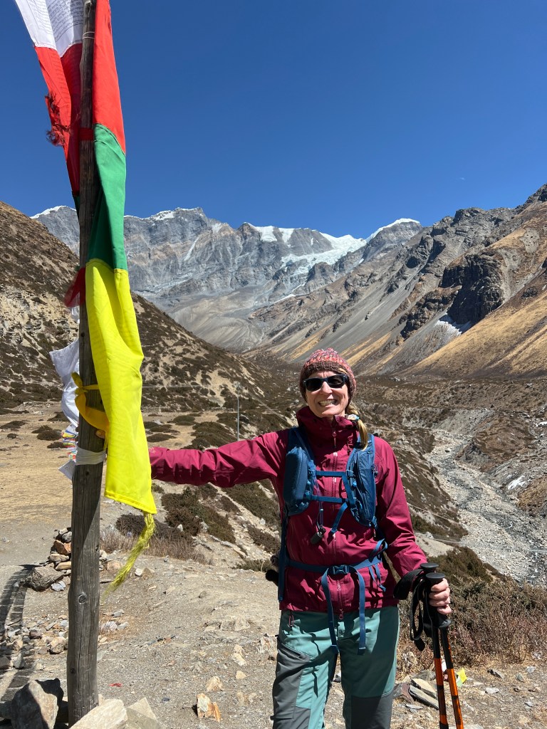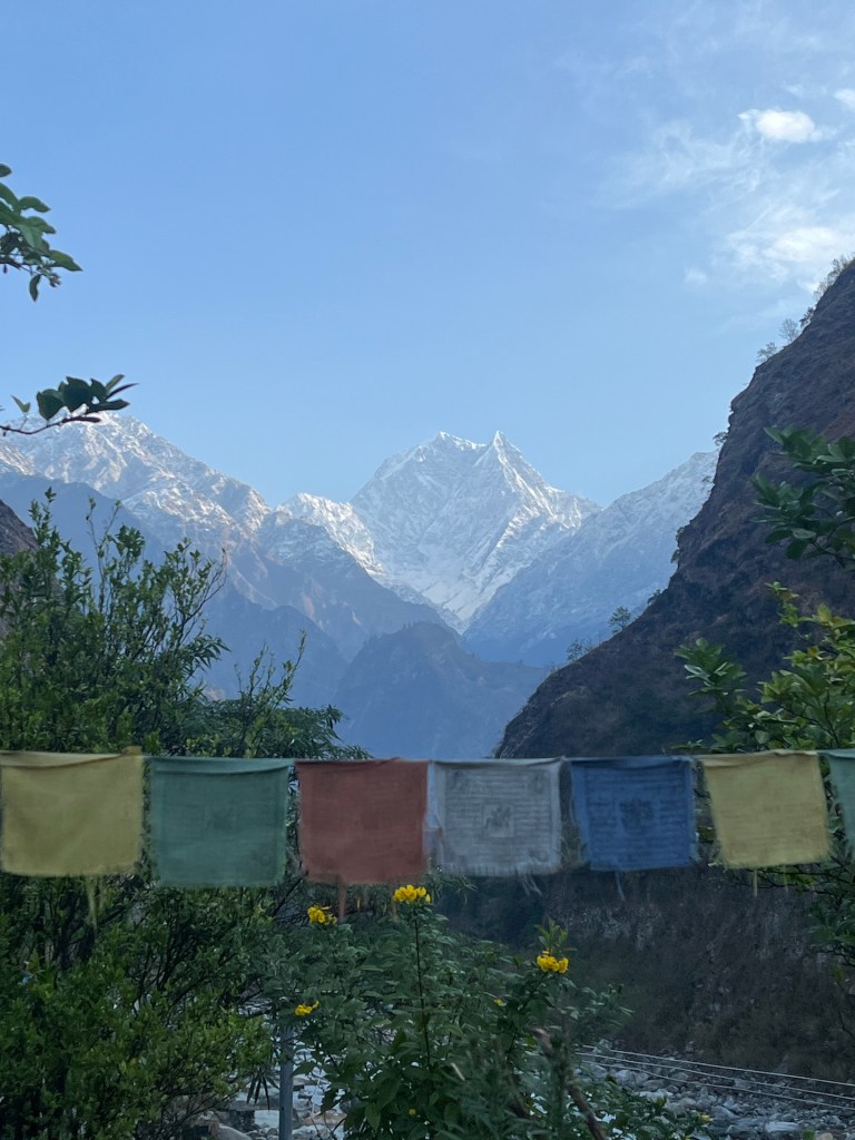 Irgendwann gegen 10Uhr sagt Tobi, dass wir im Augenblick die 5000 Höhenmeter erreicht haben. Jana rutscht ein Freudenträne raus. Wir Grinsen wie Honigkuchenpferde. Shera sagt uns, hinter der nächsten Mystery Corner sind wir da. Kein Plan, wie oft er das gesagt hat, um uns anzuspornen, doch plötzlich sehen wir vor uns ein Gewirr an unendlich vielen Gebetsfahnen. Mittendrin ein Schild mit der Aufschrift: