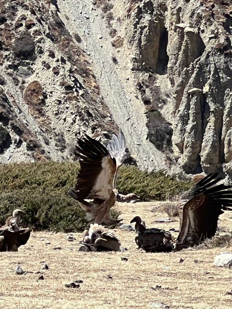Nach der Pause ziehen wir weiter, überqueren den Fluss via Hängebrücke und erreichen kurze Zeit später das erste Mal 4000 hm. 🥳 So hoch waren wir beide noch nie. Zu mindest nicht aus eigener Kraft. An diesem Punkt steht sogar ein kleines Teehaus aus Stein und Holz. Faszinierend, wie einfach und glücklich einige Menschen hier leben. Als wir weiterziehen fallen uns riesige Vögel am Firmament auf. Sind das Adler? Nein, es sind Aasgeier. Irgendwo auf der Hochebene muss ein Tier verendet sein. Auch wenn es sich merkwürdig anhört, wir haben uns auf die Suche nach dem Kadaver gemacht und wurden fündig. Etwa fünf Meter entfernt setzen wir uns und warten still. Es vergehen einige Minuten, dann stürzen die riesigen Federtiere hinab. Sie zanken sich um jeden Bissen, begleitet von schrillem und gurgelndem Kreischen. Wahnsinn, sowas haben wir noch nie erlebt. Eine Weile beobachten wir das Spektakel.
