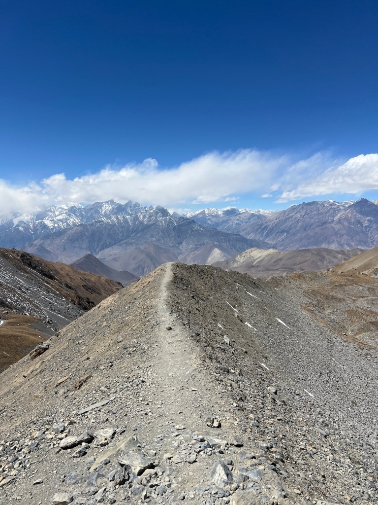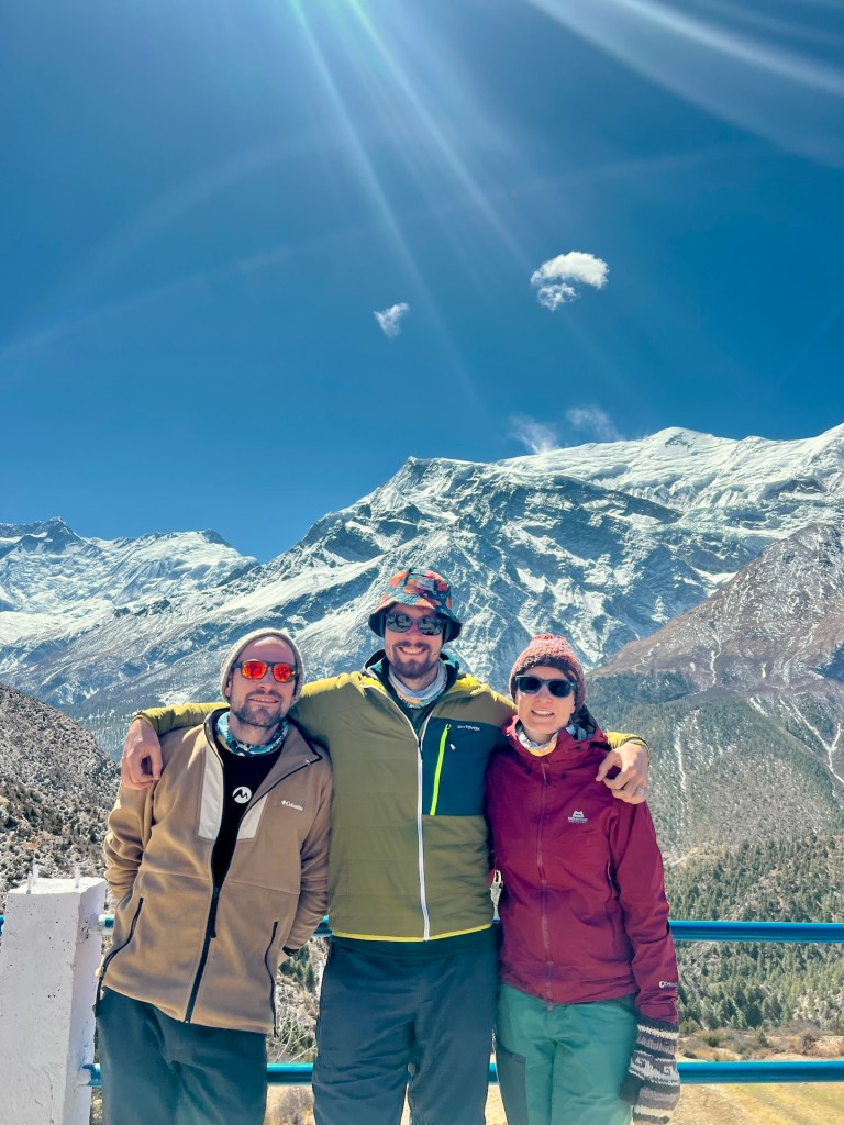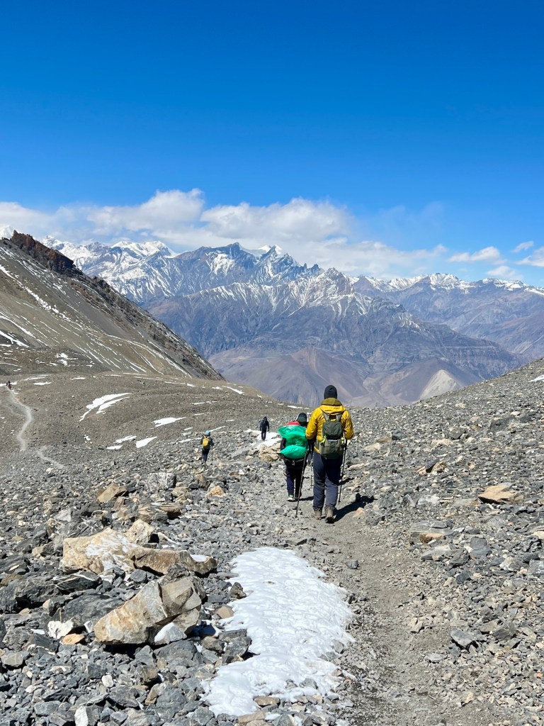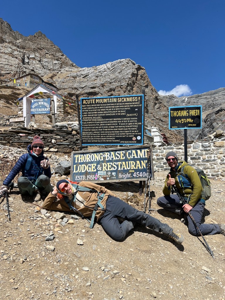 Nachdem wir uns ein wenig beruhigt haben, schießen wir ein paar Fotos. Auch die Mädels haben es geschafft. Um der Höhenkrankheit zu entfliehen begeben wir uns schnellstmöglich auf den Weg nach unten. Christian geht es etwas schlechter, so wandern wir schnellen Fußes mit wenigen Pausen ab, ab, ab. Bistari gehört der Vergangenheit an. Als wir tausend Höhenmeter hinter uns gelassen haben, machen wir Mittagspause. Auch Tobi und Jana bekommen nun Kopfweh, allerdings vermuten wir, dass es auch die Anspannung sein könnte, die allmählich nachlässt. Nach dem Essen wandern wir bis nach Muktinath. Shera hat uns bereits verraten, dass wir dort endlich wieder eine heiße Dusche haben und vor allem auch duschen dürfen. Ab 4000hm wird empfohlen nicht mehr zu duschen, da die Poren sich beim Duschen öffnen und so der Körper schneller auskühlt, der Kreislauf belastet wird und auch Wärme verloren geht. Da wir trotz der Anstrengungen seit vier Tagen nicht mehr geduscht haben, ist das unsere absolute Belohnung am heutigen Tag.