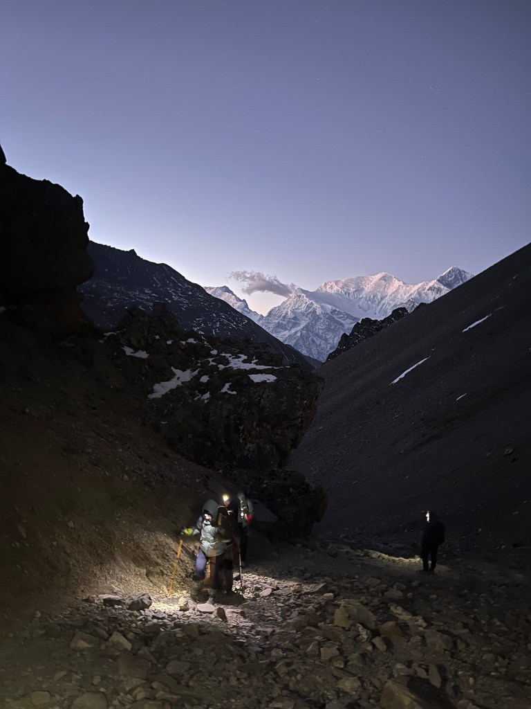 Ja! 3:30Uhr aufzustehen ist einfach erbarmungslos. Doch aufgrund dessen, dass wir alle auf diesen Tag hingefiebert haben, macht es die Müdigkeit wet. Wir quälen uns um 4Uhr Porridge und Müsli rein, um genug Energie für den Aufstieg zu haben. Wir packen uns so warm wie möglich ein, schnallen die Kopflampen um, dann geht es in absoluter Dunkelheit bergauf. Direkt am Anfang der Überquerung 400 hm. Als wir unseren Pfad betreten, können wir in der Ferne bereits ein paar wenige Lichtkegel in der Schwärze der Nacht sehen. Unsere Finger umklammern mit gefrorenen Fingerkuppen die Wanderstöcke. Obwohl wir je zwei paar Handschuhe tragen kriecht die Kälte in die Knochen. Nur nicht stehen bleiben. Unsere Trinkblasen konnten wir nicht mehr in unsere Rucksäcke packen, da sie gefroren wären. Flaschen kamen für uns nicht in Fragen, daher haben wir die 3L Blasen zwischen der letzten Pulloverschicht und der Winterjacke gesteckt. So gewährleisten wir, dass das Wasser flüssig bleibt und wir nicht immer stehen bleiben müssen, um etwas zu trinken. Es klappt. Nur das Wasser am Mundstück müssen wir durchbeißen, der Rest bleibt im trinkbaren Aggregatzustand. Nur nicht stehen bleiben. Der Mond und die Sterne sind unsere Begleiter. Es herrscht konzentrierte Stille. Shera sagt immer wieder Bistari, bistari. Es bedeutet „Langsam, langsam.“ In der Höhe macht man jeden Schritt ruhig und konzentriert. Die Atmung geht schneller als gewöhnlich. Aufgrund der Kälte ist unser Gesicht komplett eingepackt, so das unsere Lungen und Bronchien warm bleiben und der Atem nicht gefriert. Nur nicht stehen bleiben. Bistari.