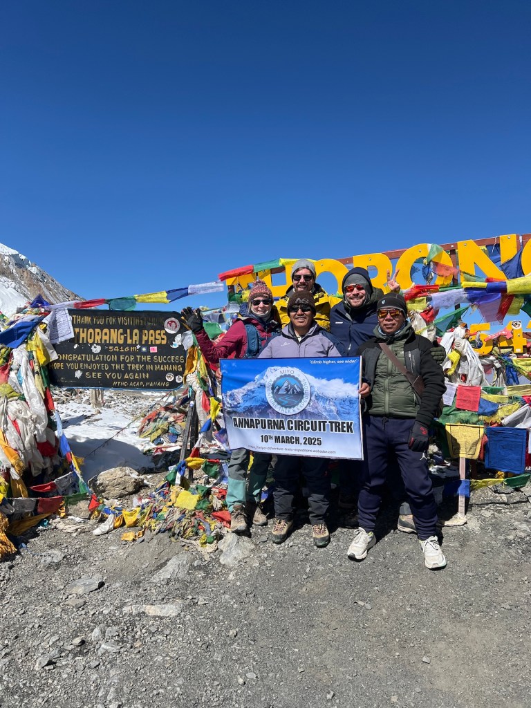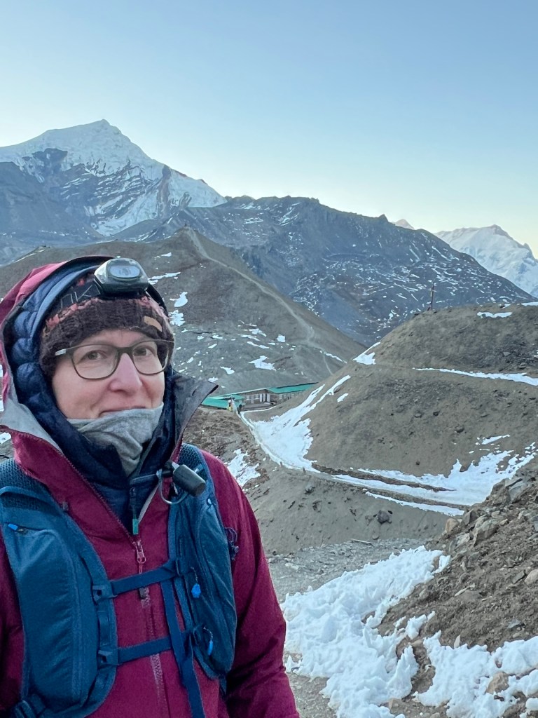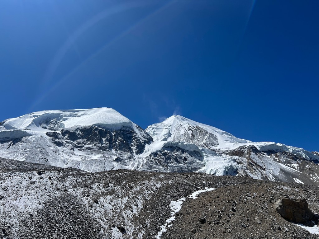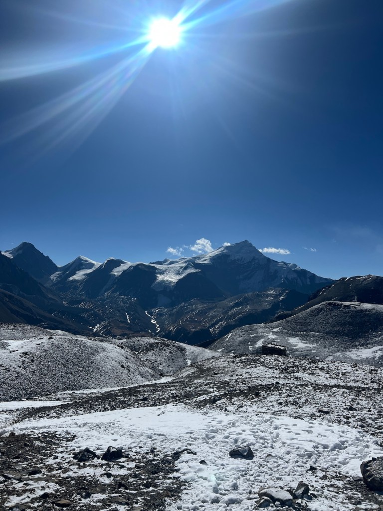 Nach zwei Stunden sehen wir einen hellen Streifen über den Berggipfeln. Die Sonne geht auf. Der Himmel wechselt von dunkelblau zu sanftem Flieder. Die weiße Spitze des Annapurna leuchtet golden über uns, wie ein wachender Engel. Als der Himmel babyblau ist, haben wir 400hm überwunden und das Thorong High Camp erreicht. Erleichterung pur, denn die Hälfe der zu überwindenden Höhenmeter sind geschafft. Wir verweilen nicht hier, da wir noch einige Kilometer vor uns haben. Die Sonne hat endlich die Gipfel überwunden und bringt uns ein paar wärmende Strahlen mit. Die Wege sind noch mit Schnee bedeckt, doch Crampons benötigen wir nicht. Immer wieder bleiben wir kurz stehen, genießen die Aussicht über diese beeindruckende Einöde aus einer anderen Welt und verschnaufen. Wir würden lügen, wenn wir sagen würden, dass es genau so einfach ist aufzusteigen, wie die letzten Tage. Dennoch überraschend machbarer als erwartet. Ein Mädchen aus der Truppe um Vivi hatte keine Kraft mehr für den Aufstieg und hat sich ein Pferd geliehen. Überall auf dieser Route sind sie zu finden und bringen Wanderer gegen Dollar über den Pass. Die Kosten dafür liegen bei ca. 150 USD. Wir schauen ihr nach und sich stolz, dass wir alle noch Kraft in uns tragen. Christian hat Kopfschmerzen bekommen und nimmt auf Anraten von Shera noch eine weitere Ibuprofen. Uns ist klar, wenn wir oben sind, bleiben wir nur kurz, dann müssen wir schnell wieder runter. Mindestens 1000hm.