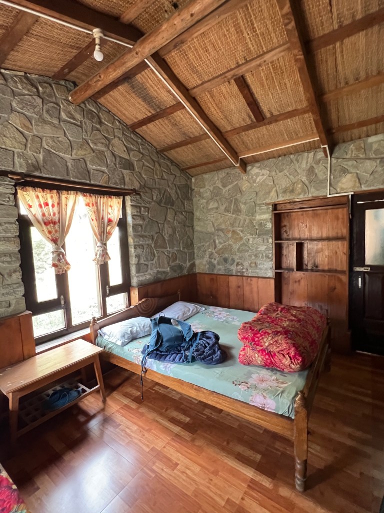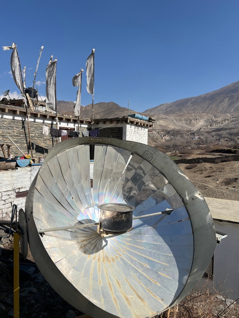 Unsere Zimmer sind noch nicht fertig, daher entspannen wir uns im Gemeinschaftsraum. Der Ofen ist noch nicht an, daher kuscheln wir uns in eine Decke ein. Nach einem Festmahl, schlummern wir ein wenig, bis wir unsere Zimmer beziehen können. Da der Strom in den Bergen knapp ist, stehen überall an den Häusern Heißwasseraufbereiter in Form von runden Sonnenreflektoren und in der Mitte ein Topf oder Teekessel. Im Zimmer haben wir ein Loch im Boden, welches wir Toilette nennen dürfen und einen dauerhaft laufenden Wasserhahn, den wir nicht ausstellen dürfen, da die Leitungen sonst einfrieren. Links neben unserem Bett sehen wir aus dem Fenster Yaks auf der Weide vor einem der Bergmassive. Der Abend verläuft wie jeder Abend: Essen, spielen und schnacken. Nur eines ist anders, Jana fühlt sich heute Abend nicht ganz so gut. Etwas Kopfweh, etwas Übelkeit. Shera empfiehlt ihr heute vor dem Schlafengehen die erste Paracetamol einzunehmen. Wir sind über 4000 hm und wir alle spüren es leicht, vor allem durchs häufige Wasserlassen. Da es auf dem gesamten Gelände keinen Strom gibt, außer im Gemeinschaftsraum, haben wir unsere Kopflampen mit uns. Kopflampe auf und ab in die Dunkelheit zur Toilette. Jana kommt zurück in den Gemeinschaftsraum: „Schatz! Das schaffe ich nicht, du musst bitte mitkommen.“ Nein, die Dunkelheit macht ihr zwar auch ab und an Angst, doch in dem Fall hat es andere Gründe. Christian schaut durch die Ausgangstür in die Dunkelheit und schalten den schmalen Strahl seiner Kopflampe an. Blinzelnd und heilerleuchtet schauen ihn sechs braune große Kulleraugen an. Drei Pferde stehen verteilt unangeleint im Weg herum. Wie ein Messer durch weiche Butter bahnt sich Christian dicht von Jana gefolgt den Weg durch die kleine Herde. Geschafft. Auf dem Rückweg treffen sie noch auf ein paar Yaks. So eine schöne Atmosphäre.