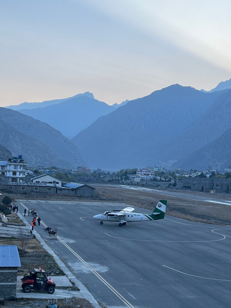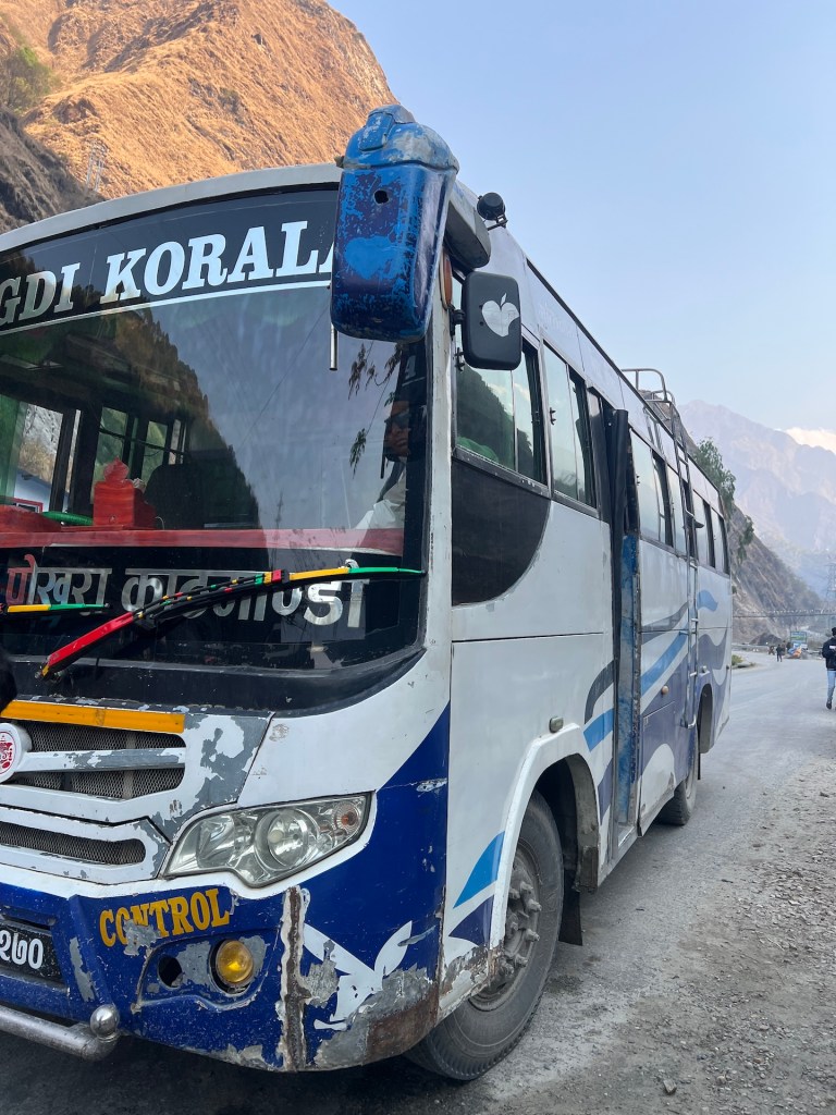 Früh aufstehen müssen wir trotzdem. Gut für uns, so können wir eines der Flugzeuge starten und landen sehen. Der Bus hält direkt vor dem Hotel an und wir dürfen ganz vorne sitzen. Wie schon erwähnt, ist Nepal sehr staubig, so auch der zerbrechliche Bus. Tobi klopft einmal auf die Lehne des Sitzes und eine Staubwolke verteilt sich. Wahnsinn. Auch die Fahrt ist wie jede hier. Hüpfend festhalten und hoffen, dass der Bus jede Kurve und jedes Schlagloch überlebt. Er quietscht an allen Ecken und Ende. Die Fenster klappern. Der Bus hält andauernd an, mal weil jemand auf Toilette muss, mal weil wer einkaufen will. Irre. Und wenn er sich nicht durch meterhohe Schlaglöcher kämpfen muss, dann fährt er mit Affenzahn um die Kurven. Wenn man sich den Bus anschaut, dann sieht man, dass er so manches Ausweichmanöver nicht geschafft hat. 🫣
