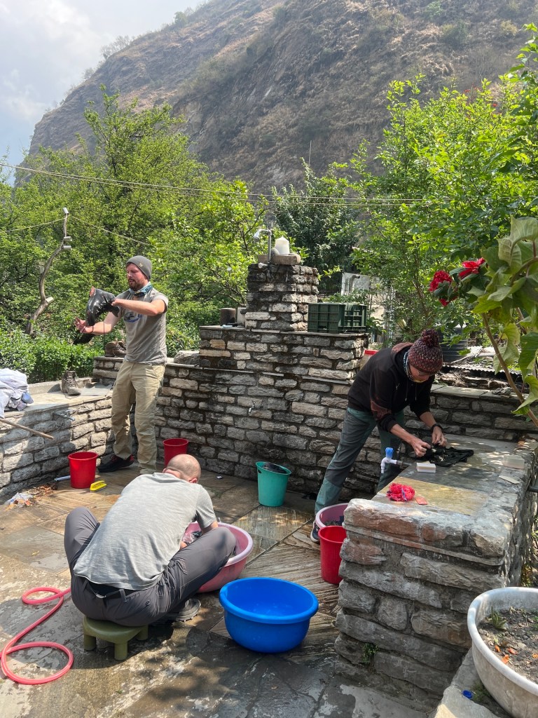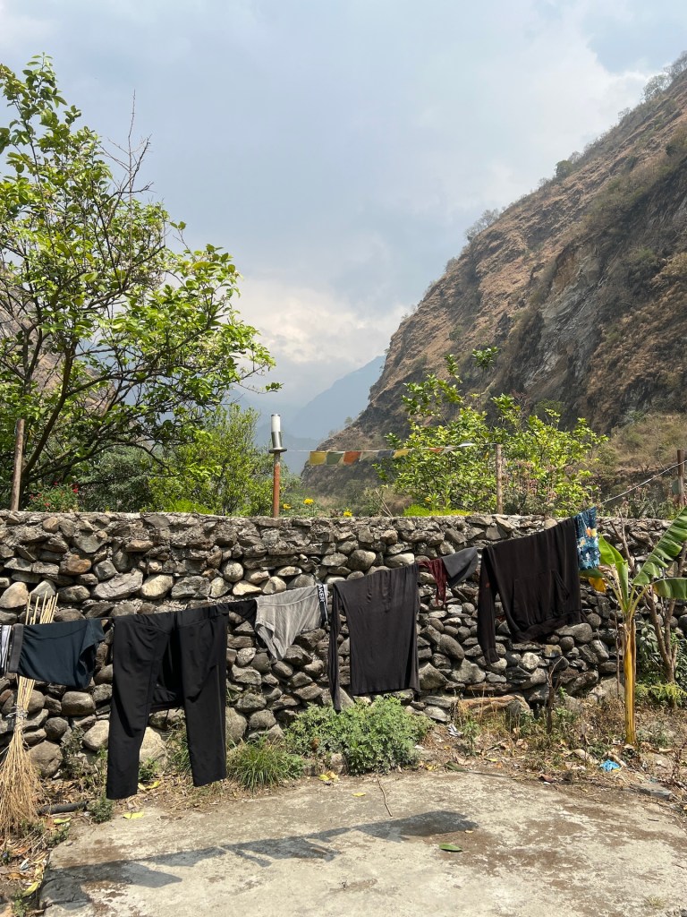 Nach etwa vier Stunden sind wir bereits in Tatopani. Im grünen Garten unserer Unterkunft entspannen wir uns, bevor wir ans Werk gehen. Waschtag. Nach den Tagen der Kälte sind wir im Frühling angekommen. Die Sonne scheint und es sind gefühlte 20 Grad. Was so ein paar tausend Höhenmeter ausmachen. Shera zeigt uns die Waschstelle und drückt uns eine Waschseife inklusive einer Schüssel in die Hand. Dann wird geschrubbt. Einige unserer Klamotten tragen wir seit über einer Woche. Ein gutes Gefühl, sie vom Dreck zu befreien. Die Sonne ist stark genug, dass die Wäsche locker bis abends trocken wird. Ja, oder auch nicht. Etwa eine halbe Stunde nach dem Aufhängen ziehen Wolken über die Bergkuppen und das Tal verdunkelt sich. Nur das wäre ja langweilig, daher gibts noch Platzregen. Zum Glück hat Tobi ein 50m Seil mit auf den Trek genommen. Unser Zimmer ist groß genug und so wird umdisponiert.