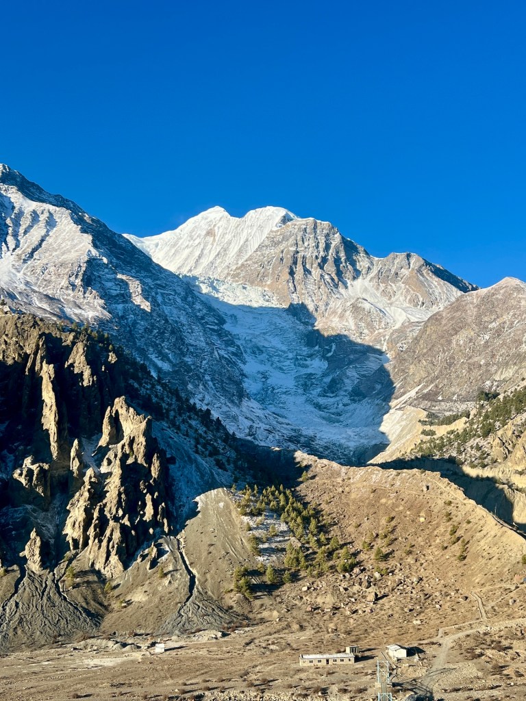 Mit dem Annapurna III im Rücken und der Sonne im Gesicht laufen wir die letzten vier km zu unserem Ziel. Immer wieder ziehen Karawanen von Mulis und kleinen nepalesischen Pferden an uns vorbei. Die Bäume schwinden. Von nun an dominieren Kniehohe Büsche, Geröll und Schnee die Landschaft. In den Felswänden über uns sind die Jahrhunderte von Korrosion und tektonischen Bewegungen in anmutenden Mustern zu bestaunen. Die gewaltige Kraft der Natur spüren wir im Angesicht der massiven Felsen. Der Wind singt hier im Himalaya sein eigenes mystischen Lied. Bereits gegen vierzehn Uhr erreichen wir Yak Kharka (4018m). Das trifft sich super, denn wir haben einen Mordshunger.