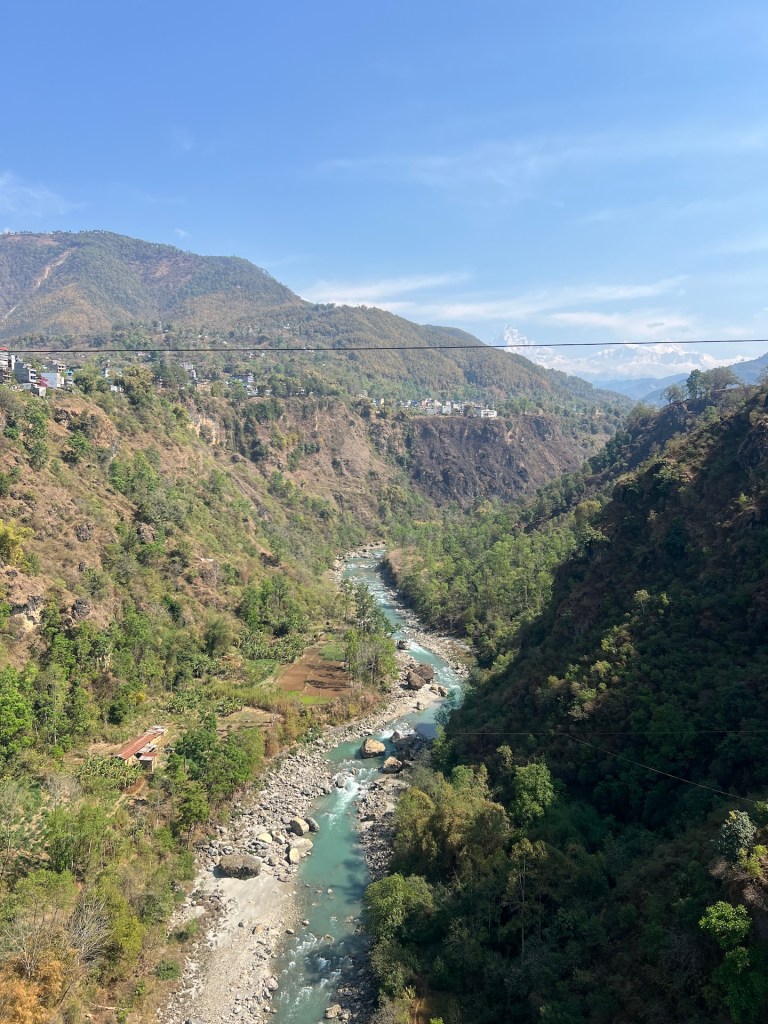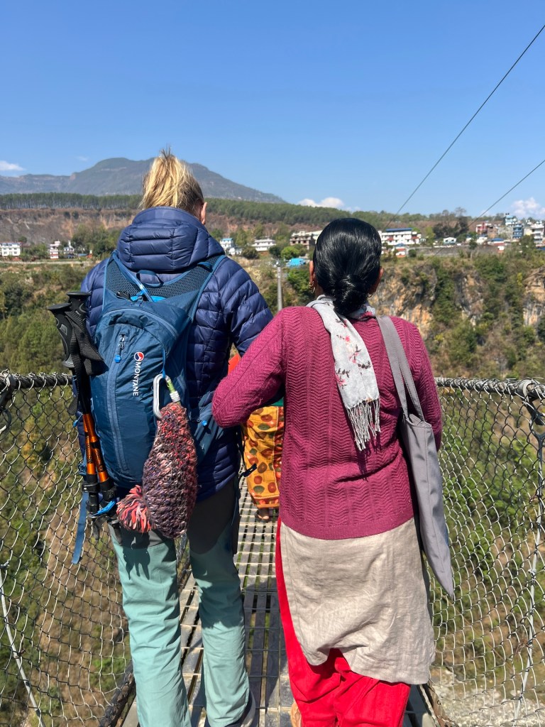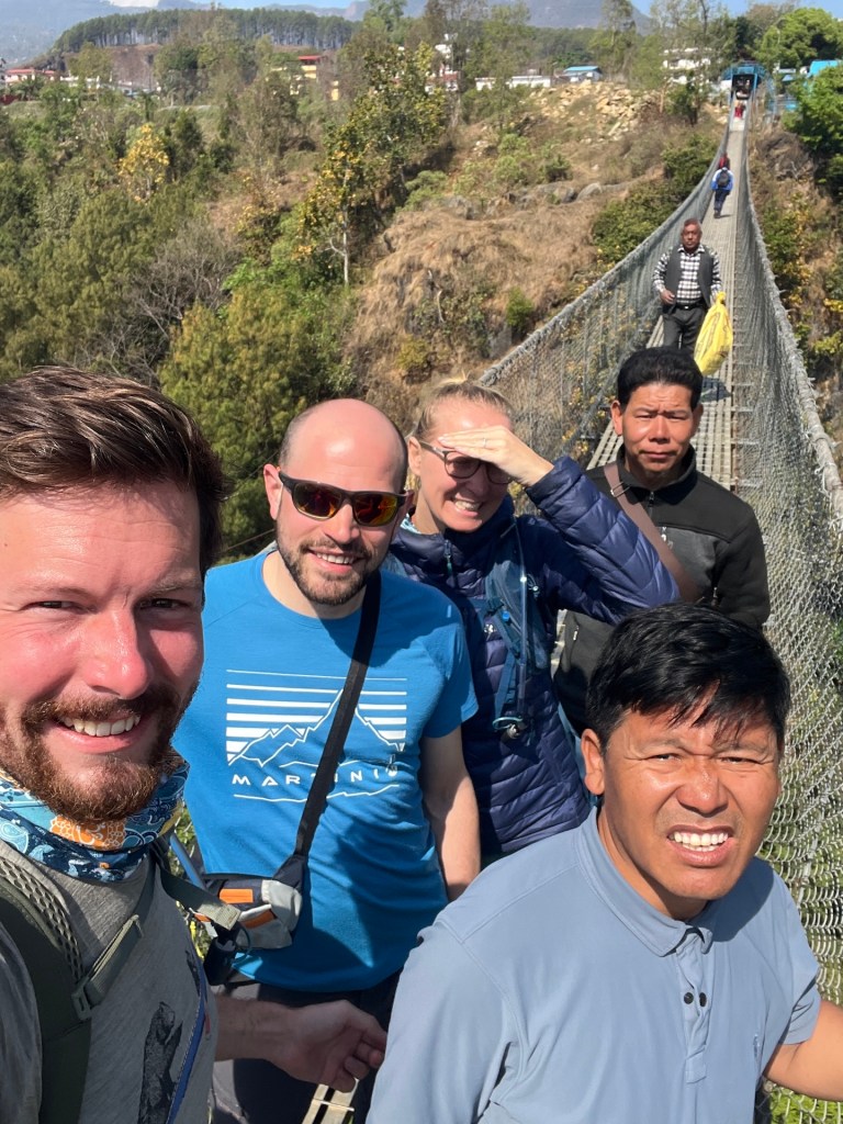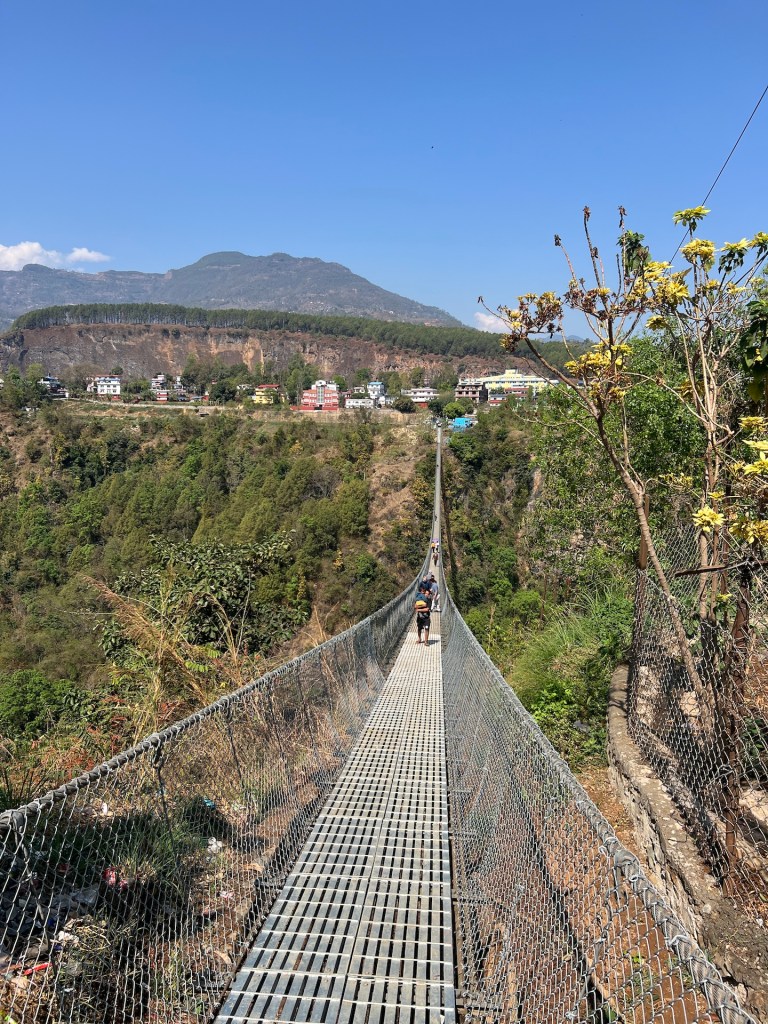 Shera hat für uns heute einen kleinen Van organisiert. Wir sammeln auf dem Weg noch ein paar Einheimische ein, die auch nach Pokhara wollen. Sie alle müssen warten, denn Shera hat noch eine kleine Überraschung für Christian. Er wollte zur längsten Hängebrücke in Nepal. Wir fahren zwar nicht da hin, aber zur angeblich höchsten in Nepal. Lang ist sie dennoch und die Aussicht ist fantastisch. Unter uns fließt der Kali Gandaki. Wir überqueren die Brücke und freuen uns wie kleine Kinder. Auf dem Rückweg bleibt Jana kurz stehen, um den Blick schweifen zu lassen. Als eine Gruppe von drei älteren Frauen sich an ihr vorbeidrückt. Sie kichern und nehmen Jana an den Arm. Sie tächeln beruhigend auf Janas Arm. Vermutlich denken sie, dass sie sich nicht rüber traut und wollen ihr helfen. Was soll´s. Die Frauen sind so freundlich, dann gehts halt jetzt rüber.